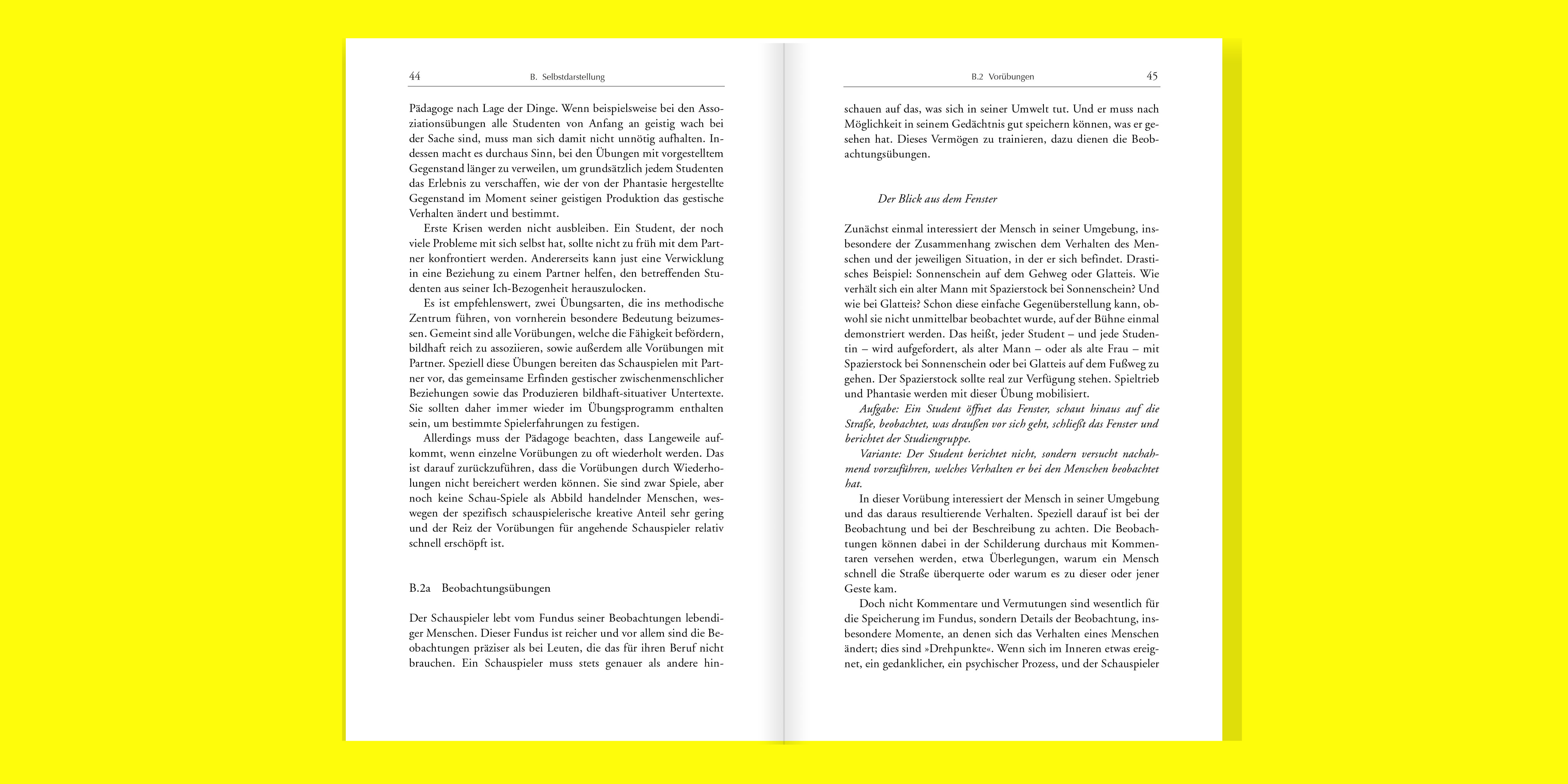 | Schlagworte | ABC • ABC des Schauspielens • Assoziationsübungen • Aufführung • Aufnahmeprüfung • Aufnahmeprüfung; Vorsprechen • Ausbildung • Ausbildung; Engagement; Studium; Berufseinstieg • Beobachtungsübungen • Berufseinstieg • Bühne • Bühnenerfahrung • Darstellendes Spiel • Einzelimprovisationen • Engagement • Entwicklung • Erfolg • Ernst Busch • Fantasie • Fantasieübungen • Fernsehen • Figurenarbeit • Film • Filmbranche • fixiertes Spiel • Gerhard Ebert • Grundausbildung • Grundlagen • Handbuch • Handwerk • Hardcover, Softcover / Kunst/Theater, Ballett • HC/Kunst/Theater, Ballett • Hochschule für Schauspielkunst Ernst Busch Berlin • Improvisation • Improvisationskunst • Improvisieren • Kamera • Karriere • Konzentrationsübungen • Krisen • Krisen; Risiko; Erfolg; Karriere • Lehrbuch • Leitfaden • Methodische Grundlagen • Partnerübungen • Professionell • Ratgeber • Ratgeber; Lehrbuch; Leitfaden • Requisiten • Risiko • Schauspielausbildung • Schauspielberuf • Schauspieldidaktik • Schauspielen • Schauspieler • Schauspieler; Handbuch/Lehrbuch • Schauspieler; Hand-/Lehrbücher • Schauspielerin werden • Schauspielern • Schauspieler, schauspielern • Schauspieler, schauspielern; Darstellendes Spiel; Theaterpädagogik; Bühne; Theater • Schauspieler werden • Schauspielgeschichte • Schauspielkunst • Schauspielmethode • Schauspielschule • Schauspieltraining • Schauspielübungen • Spielfreude • Spieltrieb • Studium • Szenen • Talent • Talent; Entwicklung; professionell • Theater • Theatergeschichte • Theaterpädagogik • Theaterpraxis • Traumberuf • Übungen • Übungen mit Requisiten • Übungen; Schauspielübungen • Voraussetzungen • Vorsprechen • Wahlrollen • Wiederholen • wie wird man schauspieler |