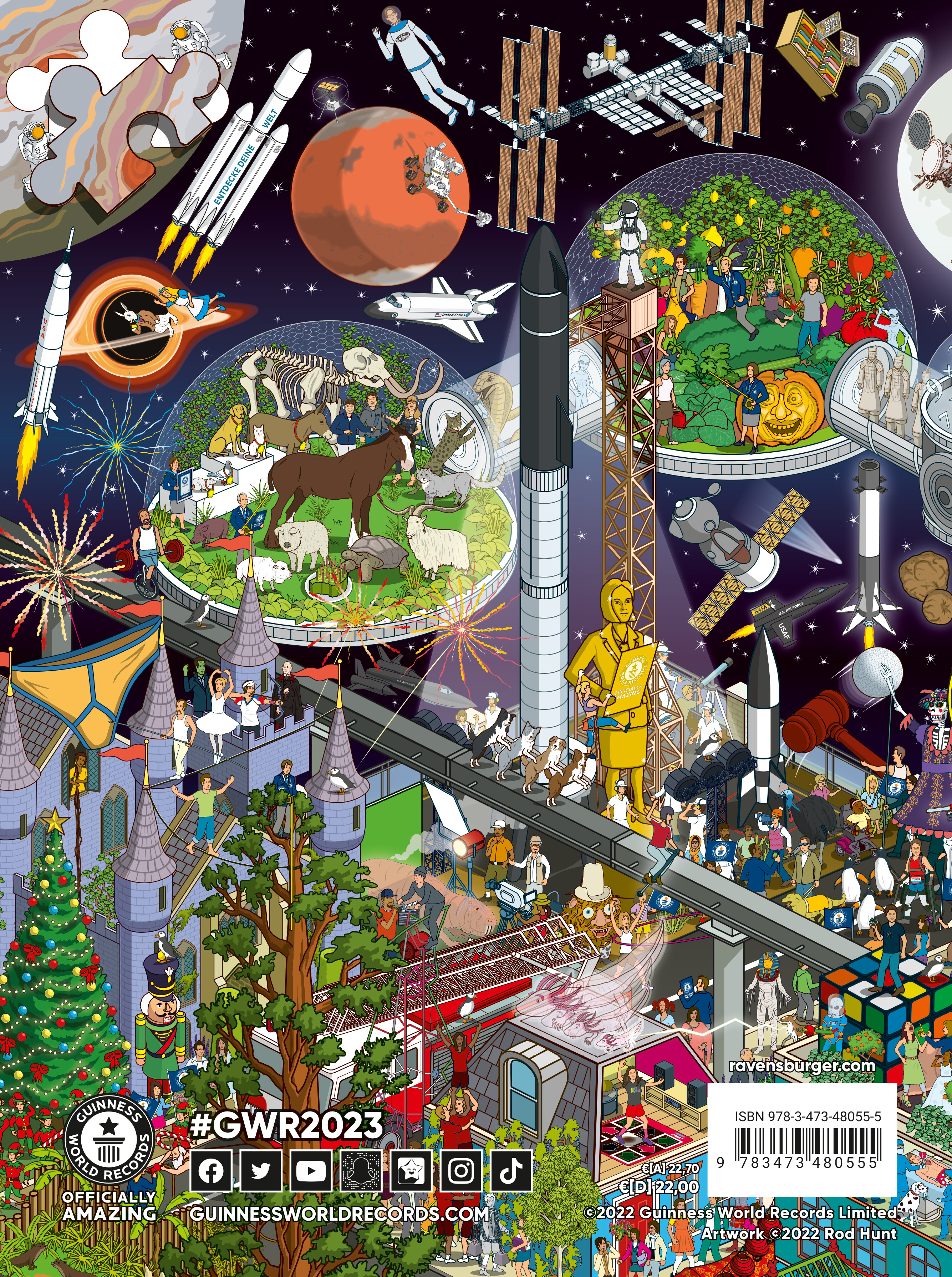Willkommen zur Ausgabe 2023 des meistverkauften Jahrbuchs der Welt, aktualisiert mit Tausenden neuen Rekorden. Wir feiern Bestleistungen in neun mit Superlativen gespickten "Missionen", und begrüßen acht neue Helden in unserer Hall of Fame. Im Zentrum der neuen Ausgabe steht das Thema Weltall, also mach dich bereit für eine atemberaubende Reise durch ein Universum voll galaktischer Rekorde. GUINNESS WORLD RECORDS (GWR) ist die weltweit anerkannte Autorität in Sachen Rekorde. Seit der Erstausgabe im Jahr 1955 hat sich das Kultjahrbuch in über 100 Ländern und 21 Sprachen mehr als 150 Millionen Mal verkauft. Mit seinen TV-Programmen erreicht GUINNESS WORLD RECORDS über 750 Millionen Zuschauer im Jahr: Über 8,7 Millionen Menschen folgen dem GWR YouTube-Channel der über 481 Millionen Mal im Jahr aufgerufen wird. GWR folgen außerdem 29 Millionen auf FacebooK und 18,3 Millionen auf TikTok.