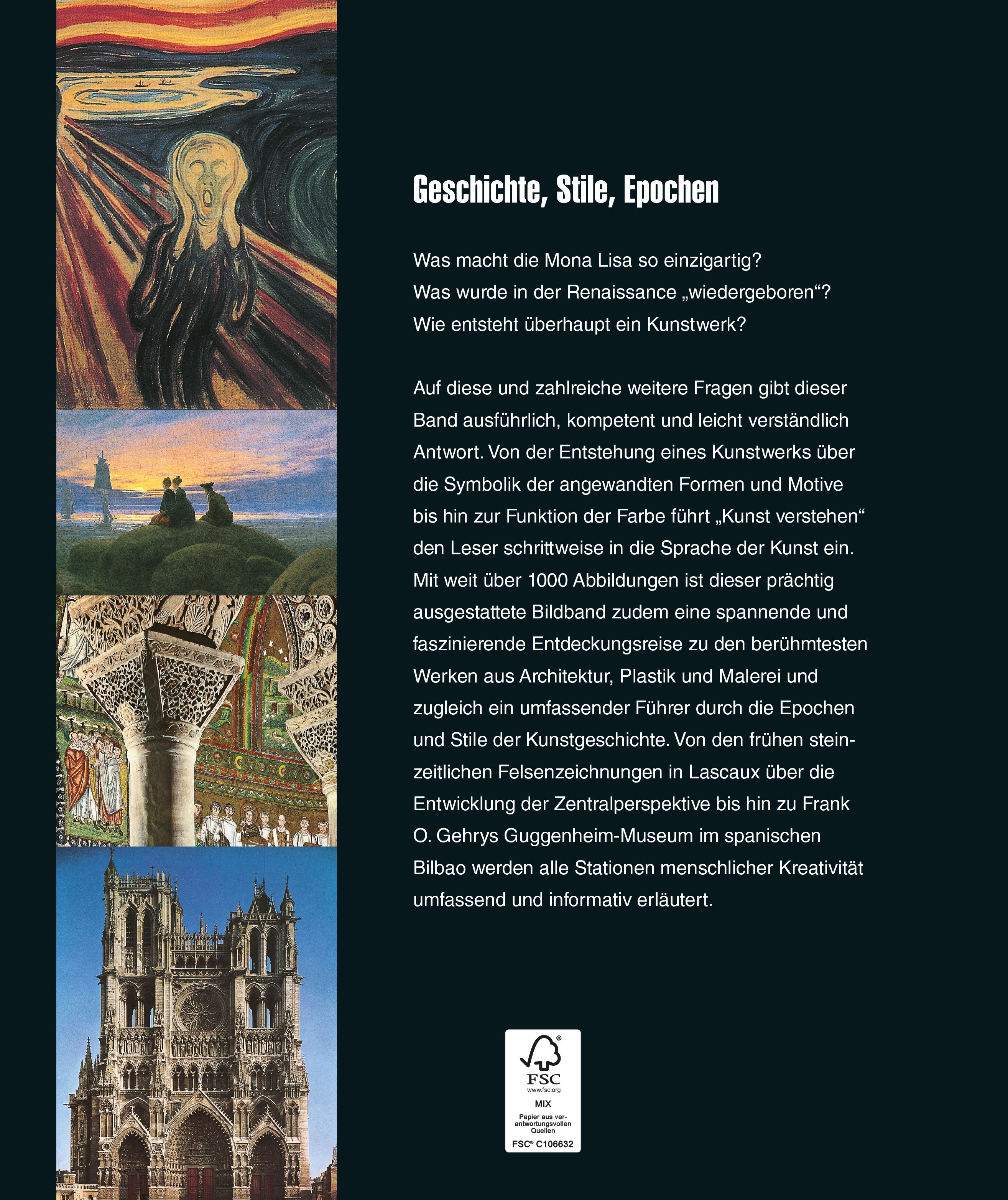 Mit weit über 1000 Abbildungen ist dieser prächtig ausgestattete Bildband zudem eine spannende und faszinierende Entdeckungsreise zu den berühmtesten Werken aus Architektur, Plastik und Malerei und zugleich ein umfassender Führer durch die Epochen und Stile der Kunstgeschichte. Von den frühen steinzeitlichen Felsenzeichnungen in Lascaux über die Entwicklung der Zentralperspektive bis hin zu Frank O. Gehrys Guggenheim-Museum im spanischen Bilbao werden alle Stationen menschlicher Kreativität umfassend und informativ erläutert.