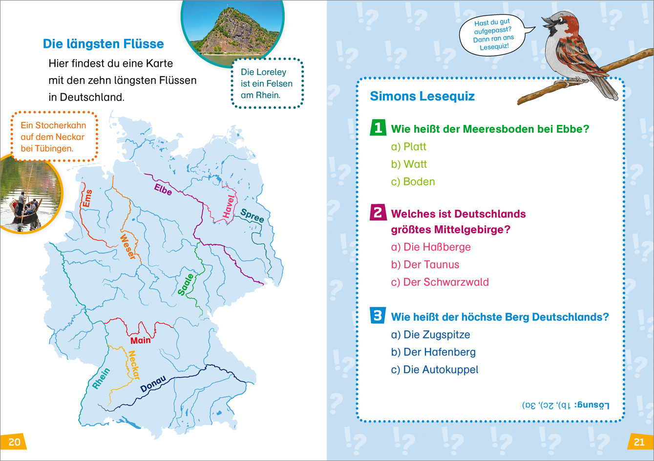 Wo liegen Hunsrück, Taunus und Eifel? Wer regiert Deutschland? Und was ist eigentlich "typisch deutsch"? Vom Wattenmeer über die Mittelgebirge bis ins Alpenvorland erhalten Leseeinsteiger in gut proportionierten Texten die wichtigsten Fakten zu Deutschland mit seiner Flora und Fauna, seinen Bergen und Flüssen, Bundesländern und Menschen, Traditionen und Sehenswürdigkeiten. Dabei sorgen lustige Informationen und überraschende Rekorde zu Land und Leuten immer wieder für Aha-Momente. Sogar einen Exkurs zum deutschen Fußball ist dabei. WAS IST WAS Erstes Lesen ist der Beweis, dass Lesenlernen mit Sachtexten alles andere als langweilig ist! Mit Lesequiz nach jedem Kapitel sowie am Ende des Buches können die Kinder das zuvor Gelesene überprüfen und vertiefen. Mit diesem Buch aus der Reihe WAS IST WAS Erstes Lesen erschließen sich Leseeinsteiger nicht nur Seite für Seite Deutschland, sondern verbessern auch ganz nebenbei die eigene Lesekompetenz!