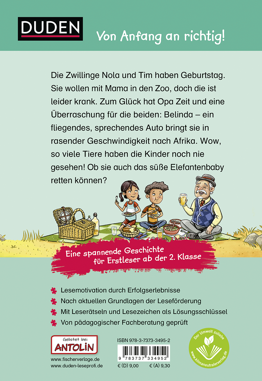 Die Zwillinge Nola und Tim haben Geburtstag. Sie wollen mit Mama in den Zoo, doch die ist leider krank geworden. Der Ausflug droht ins Wasser zu fallen, doch zum Glück hat Opa Zeit. Und der hat noch was viel Spannenderes vor und eine riesige Überraschung für die Kinder ... Ein altes, klappriges Auto verwandelt sich auf einmal in Belinda, ein fliegendes, sprechendes Auto. Es bringt die Geschwister und Opa in rasender Geschwindigkeit nach Afrika, direkt in ein spannendes Abenteuer. Dort treffen sie brüllende Löwen, elegante Giraffen, eine freche Affenbande und viele andere wilde Tiere. Wow, das ist ja wie im Fernsehen, nur noch viel besser! Was für ein Abenteuer! Ob sie auch das süße Elefantenbaby retten können?