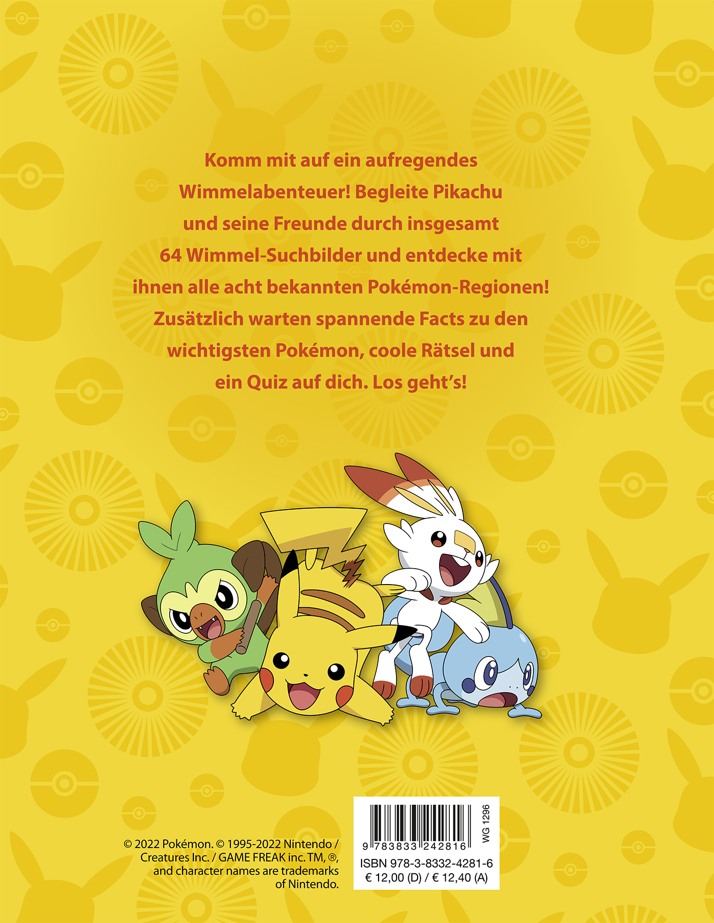 Komm mit auf ein aufregendes Wimmelabenteuer! Begleite Pikachu und seine Freunde durch insgesamt 64 Wimmel-Suchbilder und entdecke mit ihnen alle acht bekannten Pokémon-Regionen!Zusätzlich warten spannende Facts zu den wichtigsten Pokémon, coole Rätsel und ein Quiz auf dich. Los geht's!