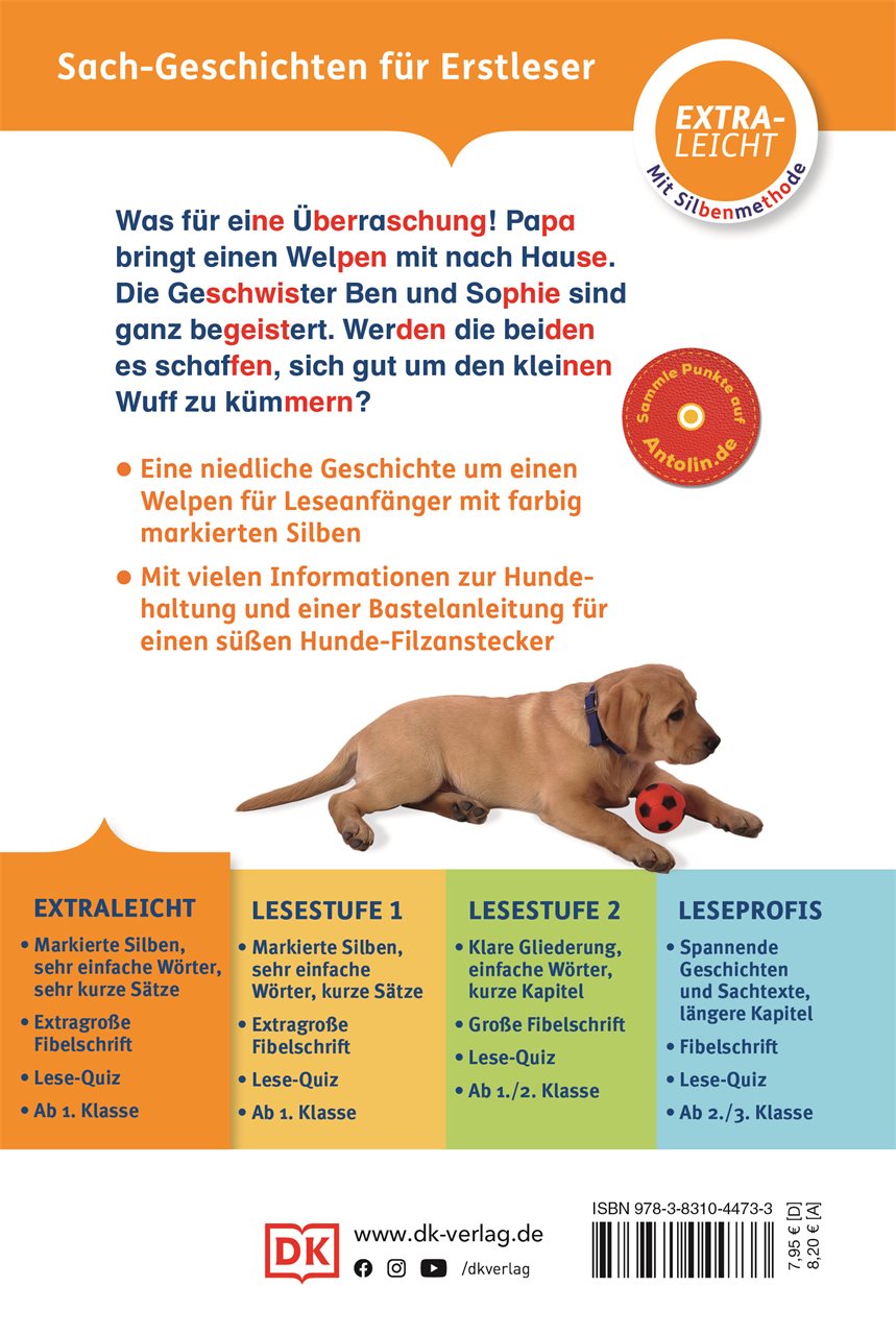 Was für eine flauschige Überraschung! In diesem SUPERLESER!-Erstlesebuch bringt Papa einen Hundewelpen nach Hause. Wuff soll er heißen! Die Kinder sind aufgeregt, denn Wuff sorgt für ordentlich Wirbel und kaut genüsslich auf Papas Schuhen herum. Bis er plötzlich verschwunden ist und sich alle auf die Suche machen. Wo steckt er bloß? Eine abenteuerliche Tiergeschichte für Kinder, dank besonders einfacher Sprache und vielen Fotos perfekt für Leseanfänger*innen.