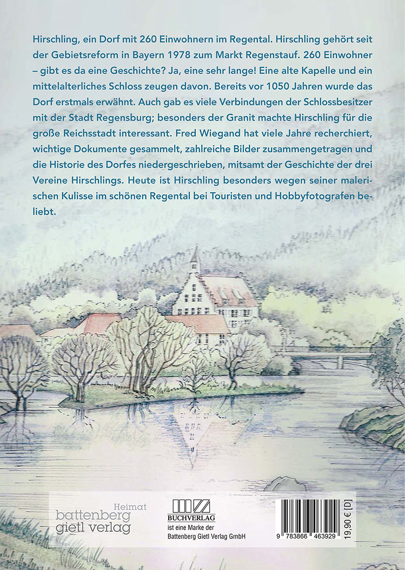 Hirschling, ein Dorf mit 260 Einwohnern im Regental. Hirschling gehört seit der Gebietsreform in Bayern 1978 zum Markt Regenstauf. 260 Einwohner - gibt es da eine Geschichte? Ja, eine sehr lange! Eine alte Kapelle und ein mittelalterliches Schloss zeugen davon. Bereits vor 1050 Jahren wurde das Dorf erstmals erwähnt. Auch gab es viele Verbindungen der Schlossbesitzer mit der Stadt Regensburg; besonders der Granit machte Hirschling für die große Reichsstadt interessant. Fred Wiegand hat viele Jahre recherchiert, wichtige Dokumente gesammelt, zahlreiche Bilder zusammengetragen und die Historie des Dorfes niedergeschrieben, mitsamt der Geschichte der drei Vereine Hirschlings. Heute ist Hirschling besonders wegen seiner malerischen Kulisse im schönen Regental bei Touristen und Hobbyfotografen beliebt.