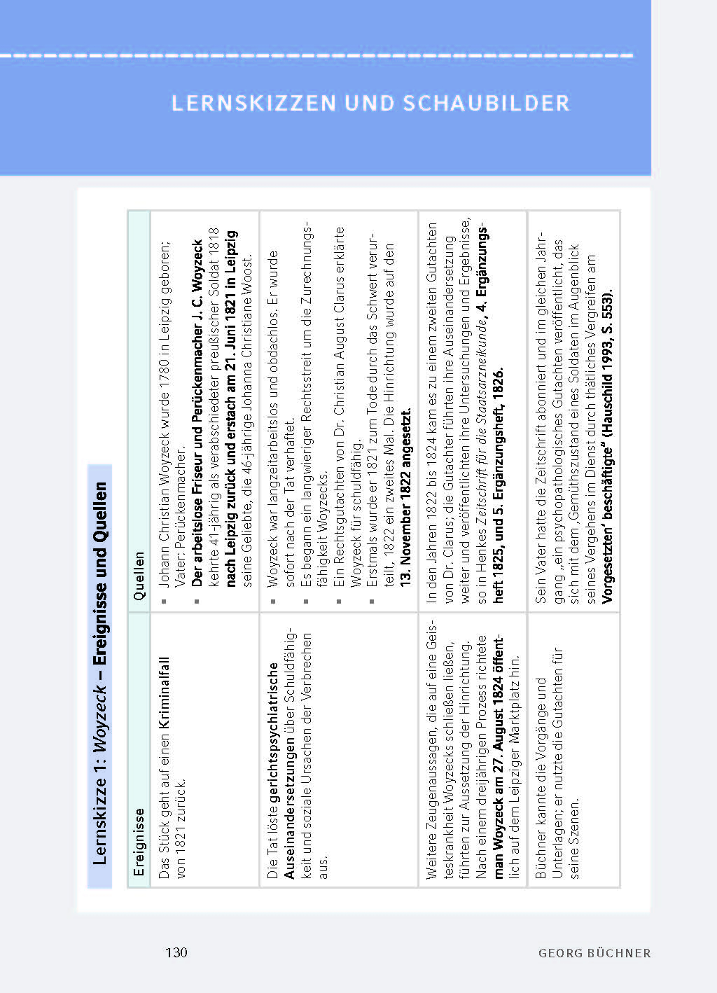 1 DAS WICHTIGSTE AUF EINEN BLICK - SCHNELLÜBERSICHT2 GEORG BÜCHNER: LEBEN UND WERK2.1 Biografie2.2 Zeitgeschichtlicher HintergrundVölkerschlacht und Wiener KongressDas Junge Deutschland und Georg BüchnerBeginn der industriellen Revolution2.3 Angaben und Erläuterungen zu wesentlichen Werken3 TEXTANALYSE UND -INTERPRETATION3.1 Entstehung und Quellen3.2 Inhaltsangabe3.3 AufbauStationendramaDer Bote aus der FremdeSymbole und Metaphern3.4 Personenkonstellation und CharakteristikenMacht und Machtlosigkeit - zwei PersonengruppenFranz WoyzeckMarie ZickwolfTambourmajorDoktor HauptmannAndresDie Personenkonstellation unter dem Aspekt der Namen3.5 Sachliche und sprachliche Erläuterungen3.6 Stil und SpracheAlltagssprache und nichtsprachliche ZeichenMetaphorische VorbereitungWindschiefe DialogeSprachartenSprachliche Mittel3.7 InterpretationsansätzeWoyzeck als Beispiel eines deformierten MenschenWoyzecks Natur und die Konventionen (Tugend)Woyzecks EntsozialisierungWoyzecks soziale und gesellschaftliche DeterminationBüchners Auffassung vom "Fatalismus"3.8 Schlüsselszenenanalysen4 REZEPTIONSGESCHICHTERezeption durch den deutschen Naturalismus nach 1875Erster Höhepunkt um 1920 und verschiedene RezeptionslinienNeue Phase der Rezeption nach 1960Büchner-Preis und -ForschungsstelleGeorg Büchner als Gegenstand der Dichtung (Auswahl)5 MATERIALIEN6 PRÜFUNGSAUFGABEN MIT MUSTERLÖSUNGENLERNSKIZZEN UND SCHAUBILDERLITERATUR