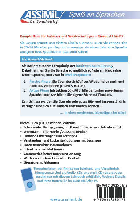 "Finnisch ohne Mühe" Lehrbuch - Niveau A1 bis B2Dieser progressiv aufgebaute ASSiMiL-Selbstlernkurs bietet Ihnen einen leichten Einstieg in die finnische Sprache und ermöglicht ihnen, in 100 Lektionen umfassend die Grundlagen des Finnischen und einen Wortschatz von ca. 2.000 Vokabeln zu erlernen.Der Sprachkurs richtet sich an Einsteiger, die die finnische Sprache gerade erst für sich entdeckt haben sowie an Fortgeschrittene, die ihre Kenntnisse auffrischen und vertiefen möchten.Am Ende erreichen Sie das sprachliche Niveau der Stufe B2 des Gemeinsamen Europäischen Referenzrahmens für Sprachen; dies entspricht ungefähr 6 Semestern VHS. Die in den Lektionen vermittelten Strukturen und der erlernte Wortschatz machen Sie fit für die mühelose Kommunikation in Alltagssituationen. In weniger als einem Jahr werden Sie sich auf Finnisch unterhalten können und das ganz ohne Auswendiglernen und Grammatikpauken.Kurze Lektionen in übersichtlicher Gestaltung fördern Ihren Lernerfolg:- Fremdsprachige Dialoge mit sinngemäßer und teilweise auch wörtlicher deutscher Übersetzung werden durch kurze, präzise Anmerkungen zu Grammatik, Vokabular und bestimmten sprachlichen Phänomenen ergänzt.- Verständnis- und Lückentextübungen helfen Ihnen, Ihren Lernfortschritt zu überprüfen.- In regelmäßigen Wiederholungslektionen wird der Stoff vertieft und anhand von Beispielen systematisch verdeutlicht, so dass Sie das Gelernte aufarbeiten und festigen können.Dieser Sprachkurs ist auch mit Tonaufnahmen und Lernsoftware erhältlich.Sprachen: Deutsch, Finnisch