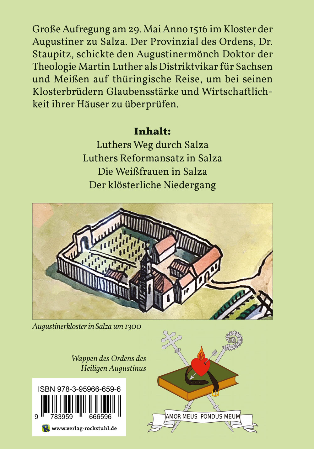 Autor Peter Ernst, Broschüre mit 40 Seiten und 40 AbbildungenGroße Aufregung am 29. Mai Anno 1516 im Kloster der Augustiner zu Salza. Der Provinzial des Ordens, Dr. Staupitz, schickte den Augustinermönch Doktor der Theologie Martin Luther als Distriktvikar für Sachsen und Meißen auf thüringische Reise, um bei seinen Klosterbrüdern Glaubensstärke und Wirtschaftlichkeit ihrer Häuser zu überprüfen.Inhalt:Luthers Weg durch SalzaLuthers Reformansatz in SalzaDie Weißfrauen in SalzaDer klösterliche Niedergang