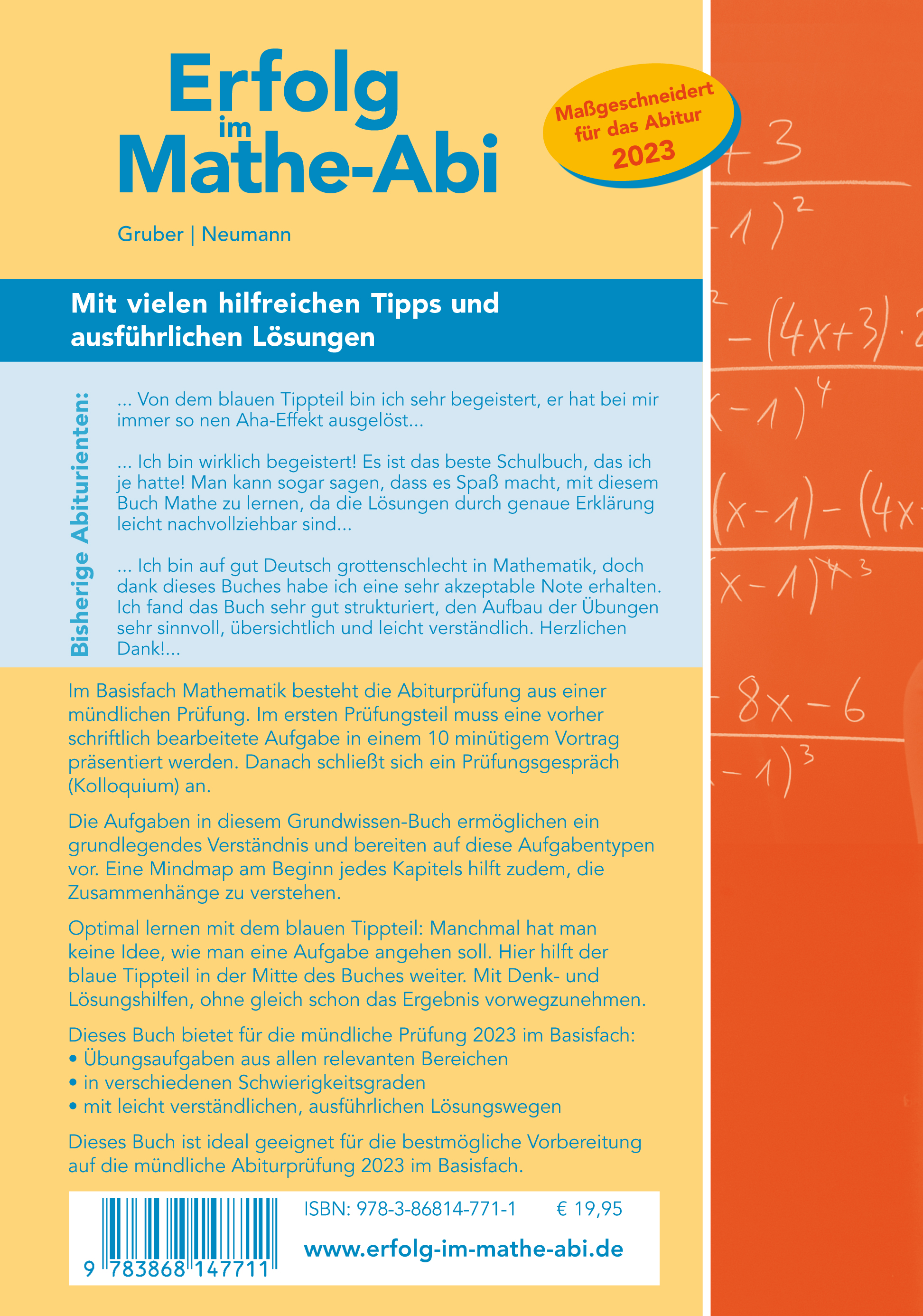 Im Basisfach Mathematik besteht die Abiturprüfung aus einermündlichen Prüfung. Im ersten Prüfungsteil muss eine vorherschriftlich bearbeitete Aufgabe in einem 10 minütigem Vortragpräsentiert werden. Danach schließt sich ein Prüfungsgespräch(Kolloquium) an.Die Aufgaben in diesem Grundwissen-Buch ermöglichen eingrundlegendes Verständnis und bereiten auf diese Aufgabentypenvor. Eine Mindmap am Beginn jedes Kapitels hilft zudem, dieZusammenhänge zu verstehen.Optimal lernen mit dem blauen Tippteil: Manchmal hat mankeine Idee, wie man eine Aufgabe angehen soll. Hier hilft derblaue Tippteil in der Mitte des Buches weiter. Mit Denk- undLösungshilfen, ohne gleich schon das Ergebnis vorwegzunehmen.Dieses Buch bietet für die mündliche Prüfung 2023 im Basisfach:- Übungsaufgaben aus allen relevanten Bereichen- in verschiedenen Schwierigkeitsgraden- mit leicht verständlichen, ausführlichen LösungswegenDieses Buch ist ideal geeignet für die bestmögliche Vorbereitungauf die mündliche Abiturprüfung 2023 im Basisfach.
