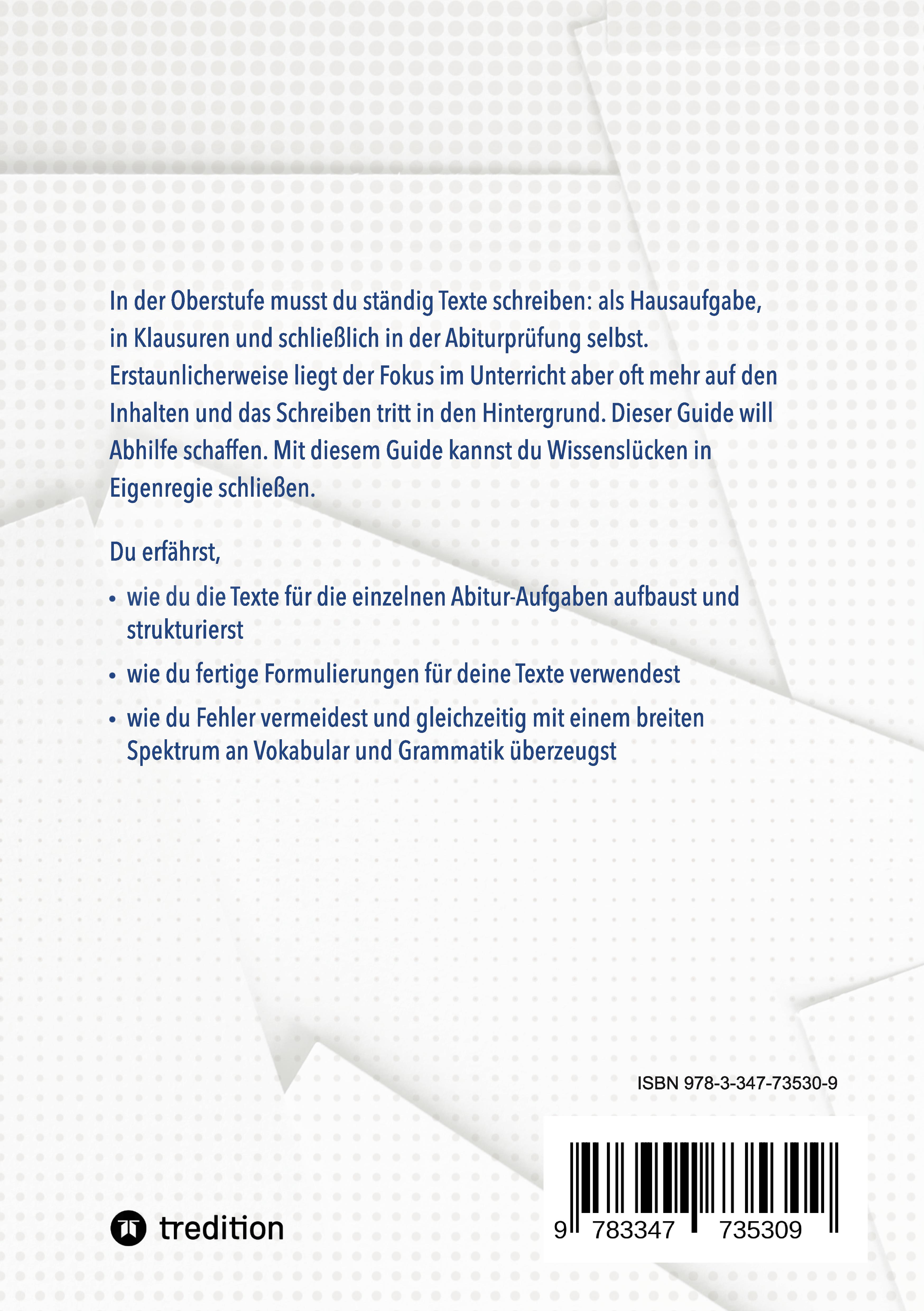 In der Oberstufe musst du ständig Texte schreiben: als Hausaufgabe, in Klausuren und schließlich in der Abiturprüfung selbst. Erstaunlicherweise liegt der Fokus im Unterricht aber oft mehr auf den Inhalten und das Schreiben tritt in den Hintergrund. Dieser Guide will Abhilfe schaffen. Mit diesem Guide kannst du Wissenslücken in Eigenregie schließen. Du erfährst, - wie du die Texte für die einzelnen Abitur-Aufgaben aufbaust und strukturierst - wie du fertige Formulierungen für deine Texteverwendest - wie du Fehler vermeidest und gleichzeitig mit einem breiten Spektrum an Vokabular und Grammatik überzeugst
