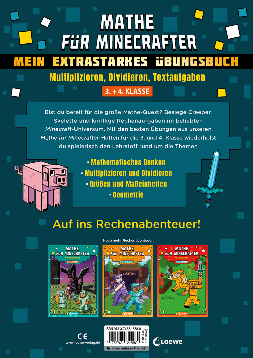 Dieses extrastarke Übungsbuch vereint spannende Matheübungen für die 3. und 4. Klasse mit dem beliebten Minecraft-Stil. Mathematisches Denken, multiplizieren und dividieren, Geometrie sowie Größen und Maßeinheiten werden auf rund 100 Seiten spielerisch leicht trainiert. So wird absolut jede Rechenaufgabe zum Abenteuer!