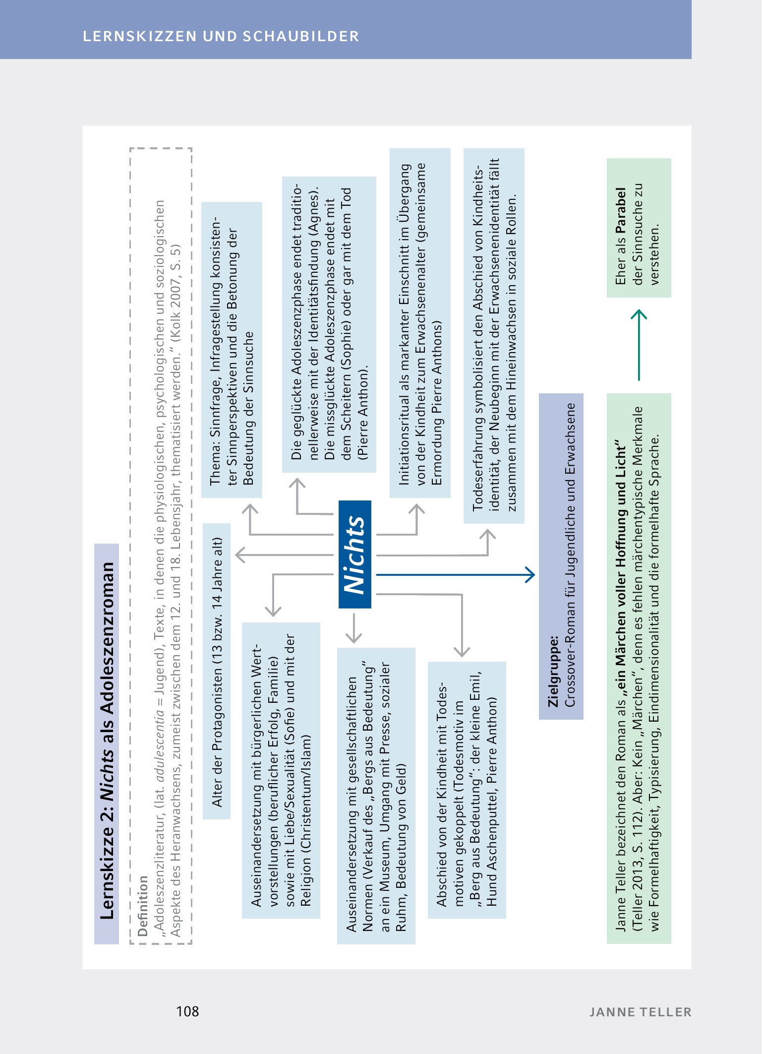 1 DAS WICHTIGSTE AUF EINEN BLICK SCHNELLÜBERSICHT2 JANNE TELLER: LEBEN UND WERK2.1 Biografie2.2 Zeitgeschichtlicher Hintergrund2.3 Angaben und Erläuterungen zu wesentlichen Werken3 TEXTANALYSE UND -INTERPRETATION3.1 Entstehung und Quellen3.2 Inhaltsangabe3.3 AufbauDie narrative HandlungsstrukturDas Zeitgefüge3.4 Personenkonstellation und CharakteristikenAgnesPierre AnthonSofieJan-JohanNebenfiguren3.5 Sachliche und sprachliche Erläuterungen3.6 Stil und SpracheGattung, Erzählweise und -strukturWortwahl, Stil und Sprache3.7 Interpretationsansätze4 REZEPTIONSGESCHICHTE5 MATERIALIENDefinition "Adoleszenzliteratur"Definition "Parabel"Definition "Nihilismus"Die "Theodizee"-FrageSinnfrage und WissenschaftAlbert Camus: Der Mythos von SisyphosJanne Teller über ihre KindheitJanne Teller über ihren Roman NichtsAuszüge aus Rezensionen zum Roman Nichts6 PRÜFUNGSAUFGABEN MIT MUSTERLÖSUNGENLERNSKIZZEN UND SCHAUBILDERLITERATUR