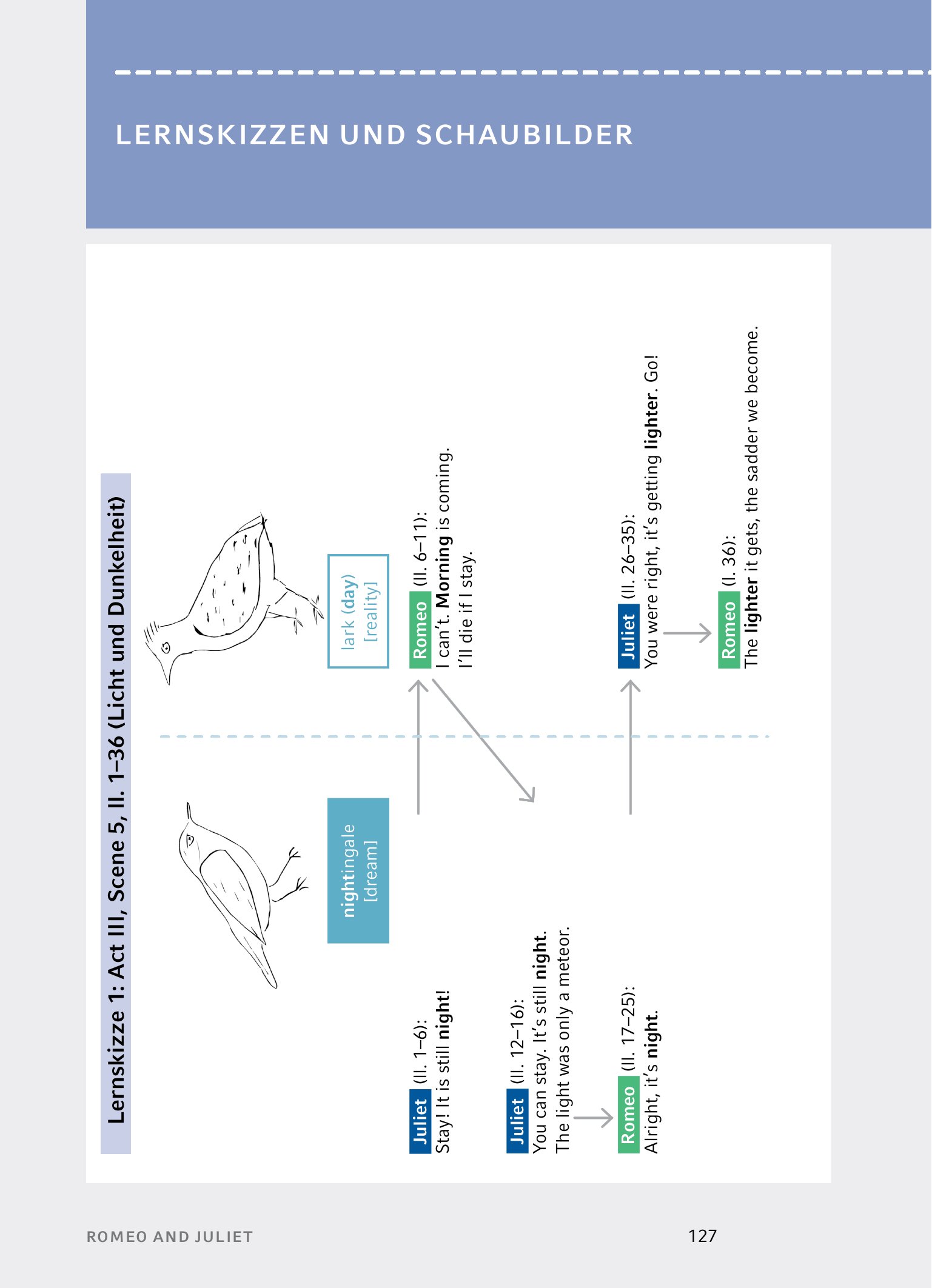 1 DAS WICHTIGSTE AUF EINEN BLICK SCHNELLÜBERSICHT2 WILLIAM SHAKESSPEARE: LEBEN UND WERK2.1 Biografie2.2 Zeitgeschichtlicher HintergrundPolitische und gesellschaftliche SituationTheater zur Shakespeare-Zeit2.3 Angaben und Erläuterungen zu wesentlichen Werken3 TEXTANALYSE UND -INTERPRETATION3.1 Entstehung und Quellen3.2 InhaltsangabeProlog (Chor)Akt l: Begegnung zwischen Romeo und JulietAkt ll: Heimliche Heirat von Romeo und JulietAkt lll: Tod und VerbannungAkt lV: Juliets Schein-TodAkt V: Tod des Liebespaars und Versöhnung3.3 AufbauDie Grundstruktur der HandlungSchauplätzeKlassische Struktur (Aristoteles)3.4 Personenkonstellation und CharakteristikenRomeoJulietFriar LaurenceDie CapuletsNurseJuliets ElternTybaltDie MontaguesBenvolioRomeos ElternDer HofMercutioPrince EscalusParis3.5 Sachliche und sprachliche Erläuterungen3.6 Stil und SpracheLiebeslyrik: Petrarca-Sonett und BlankverseWortspiele, Doppeldeutigkeiten und WortfelderStilmittel3.7 InterpretationsansätzeThemen und Motive3.8 Schlüsselszenenanalysen4 REZEPTIONSGESCHICHTE5 MATERIALIENÜber Shakespeare und seine WerkeÄußerungen zu Romeo and Juliet6 PRÜFUNGSAUFGABEN MIT MUSTERLÖSUNGENLERNSKIZZEN UND SCHAUBILDERLITERATUR