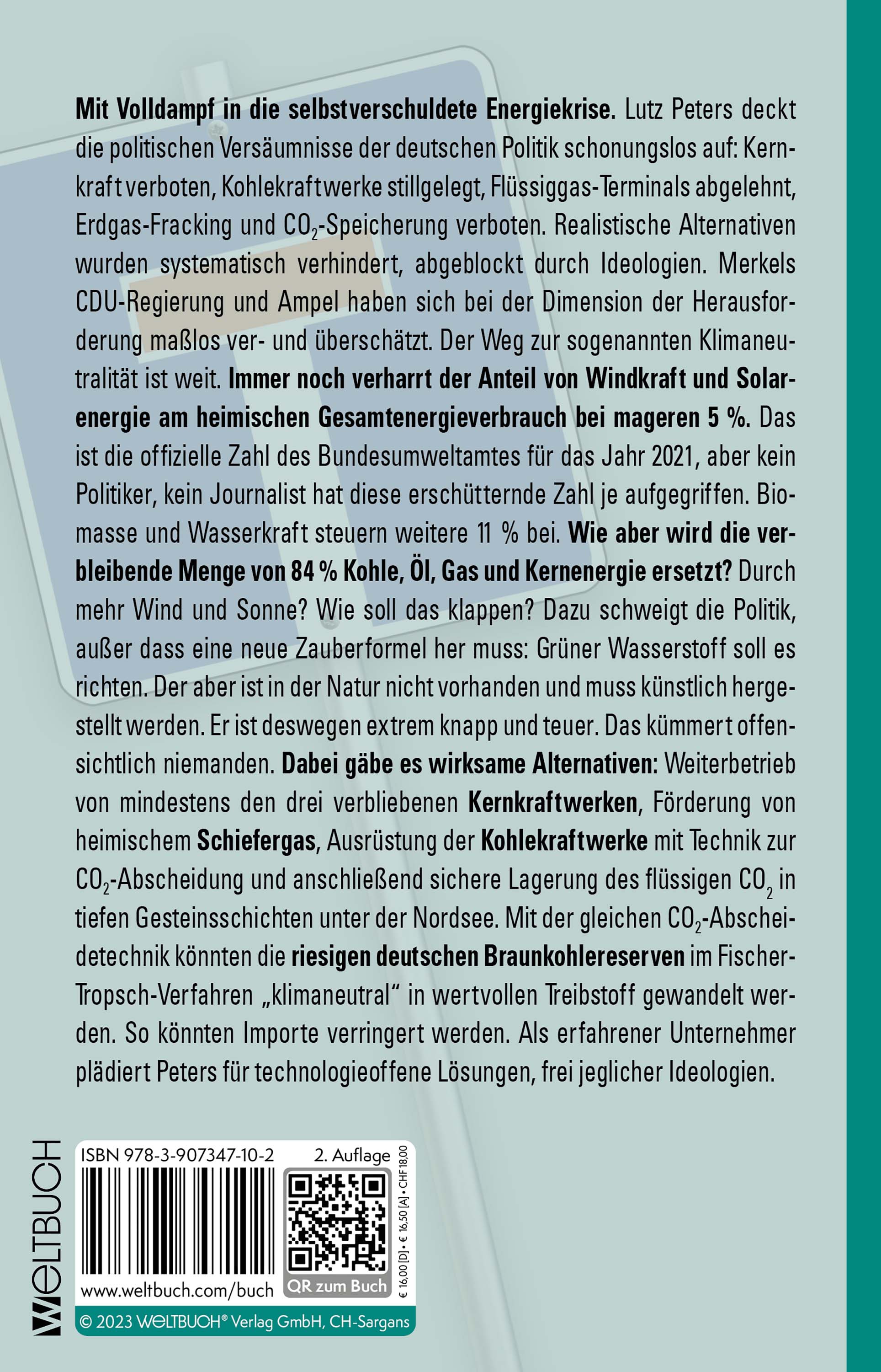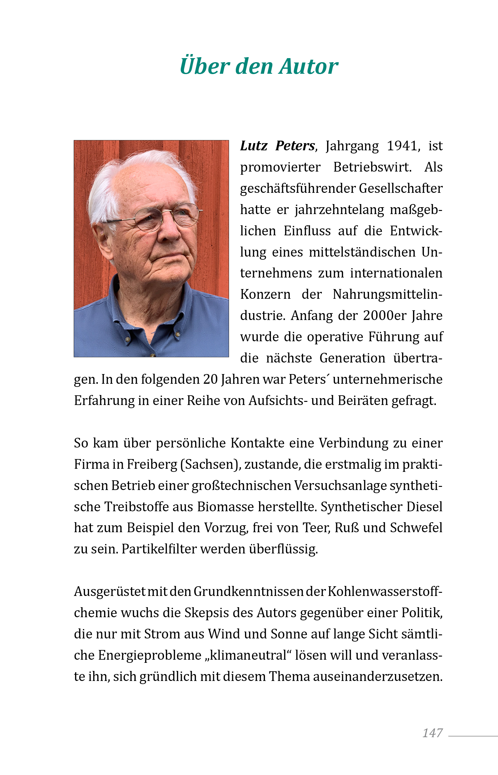 Lutz Peters, Jahrgang 1941, ist promovierter Betriebswirt. Als geschäftsführender Gesellschafter hatte er jahrzehntelang maßgeblichen Einfluss auf die Entwicklung eines mittelständischen Unternehmens zum internationalen Konzern der Nahrungsmittelindustrie.Anfang der 2000er Jahre wurde die operative Führung auf die nächste Generation übertragen.In den folgenden 20 Jahren war Peters´ unternehmerische Erfahrung in einer Reihe von Aufsichts- und Beiräten gefragt.So kam über persönliche Kontakte eine Verbindung zu einer Firma in Freiberg (Sachsen), zustande, die erstmalig im praktischen Betrieb einer großtechnischen Versuchsanlage synthetische Treibstoffe aus Biomasse herstellte. Synthetischer Diesel hat zum Beispiel den Vorzug, frei von Teer, Ruß und Schwefel zu sein. Partikelfilter werden überflüssig.Ausgerüstet mit den Grundkenntnissen der Kohlenwasserstoffchemie wuchs die Skepsis des Autors gegenüber einer Politik,die nur mit Strom aus Wind und Sonne auf lange Sicht sämtliche Energieprobleme "klimaneutral" lösen will und veranlassteihn, sich gründlich mit diesem Thema auseinanderzusetzen.