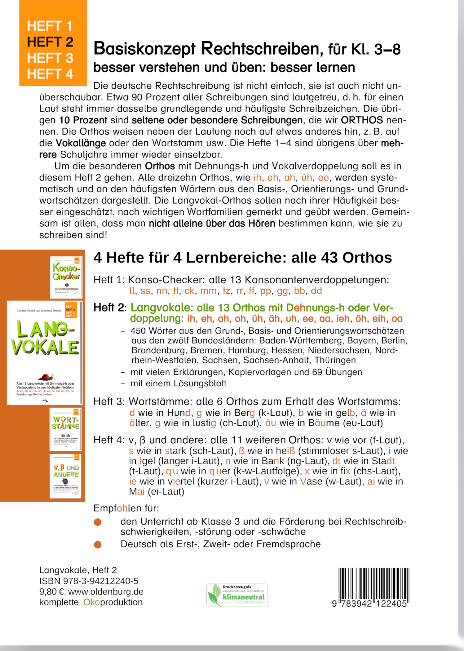 | Schlagworte | Basiskonzept Rechtschreiben • DAF • DAZ • Dehnungs-h • Deutsch • Deutschunterricht • Förderunterricht • Langvokale • Legasthenie • Logopädie • Markierungen des Langvokals • Orthographeme • Orthos • Pädagogische Psychologie • Psycholinguistik • Rechtschreibförderung • Rechtschreibschwierigkeiten • Rechtschreibung • Vokalverdoppelung • Wörterlexikon • Wortschreibung, systematisch |