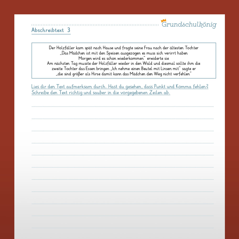 | Schlagworte | 4 Klasse • 4. Klasse • Abschreibtext • Deutsch • Grundschule • Maerchen • Märchen • Rechtschreibung • Schreiben • Text • Training |