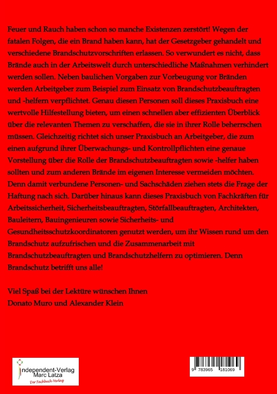 Feuer und Rauch haben schon so manche Existenzen zerstört! Wegen der fatalen Folgen, die ein Brand haben kann, hat der Gesetzgeber gehandelt und verschiedene Brandschutzvorschriften erlassen. So verwundert es nicht, dass Brände auch in der Arbeitswelt durch unterschiedliche Maßnahmen verhindert werden sollen. Neben baulichen Vorgaben zur Vorbeugung vor Bränden werden Arbeitgeber zum Beispiel zum Einsatz von Brandschutzbeauftragten und -helfern verpflichtet.Genau diesen Personen soll dieses Praxisbuch eine wertvolle Hilfestellung bieten, um einen schnellen aber effizienten Überblick über die relevanten Themen zu verschaffen, die sie in ihrer Rolle beherrschen müssen. Gleichzeitig richtet sich unser Praxisbuch an Arbeitgeber, die zum einen aufgrund ihrer Überwachungs- und Kontrollpflichten eine genaue Vorstellung über die Rolle der Brandschutzbeauftragten sowie -helfer haben sollten und zum anderen Brände im eigenen Interesse vermeiden möchten. Denn damit verbundene Personen- und Sachschäden ziehen stets die Frage der Haftung nach sich. Darüber hinaus kann dieses Praxisbuch von Fachkräften für Arbeitssicherheit, Sicherheitsbeauftragten, Störfallbeauftragten, Architekten, Bauleitern, Bauingenieuren sowie Sicherheits- und Gesundheitsschutzkoordinatoren genutzt werden, um ihr Wissen rund um den Brandschutz aufzufrischen und die Zusammenarbeit mit Brandschutzbeauftragten und Brandschutzhelfern zu optimieren. Denn Brandschutz betrifft uns alle!
