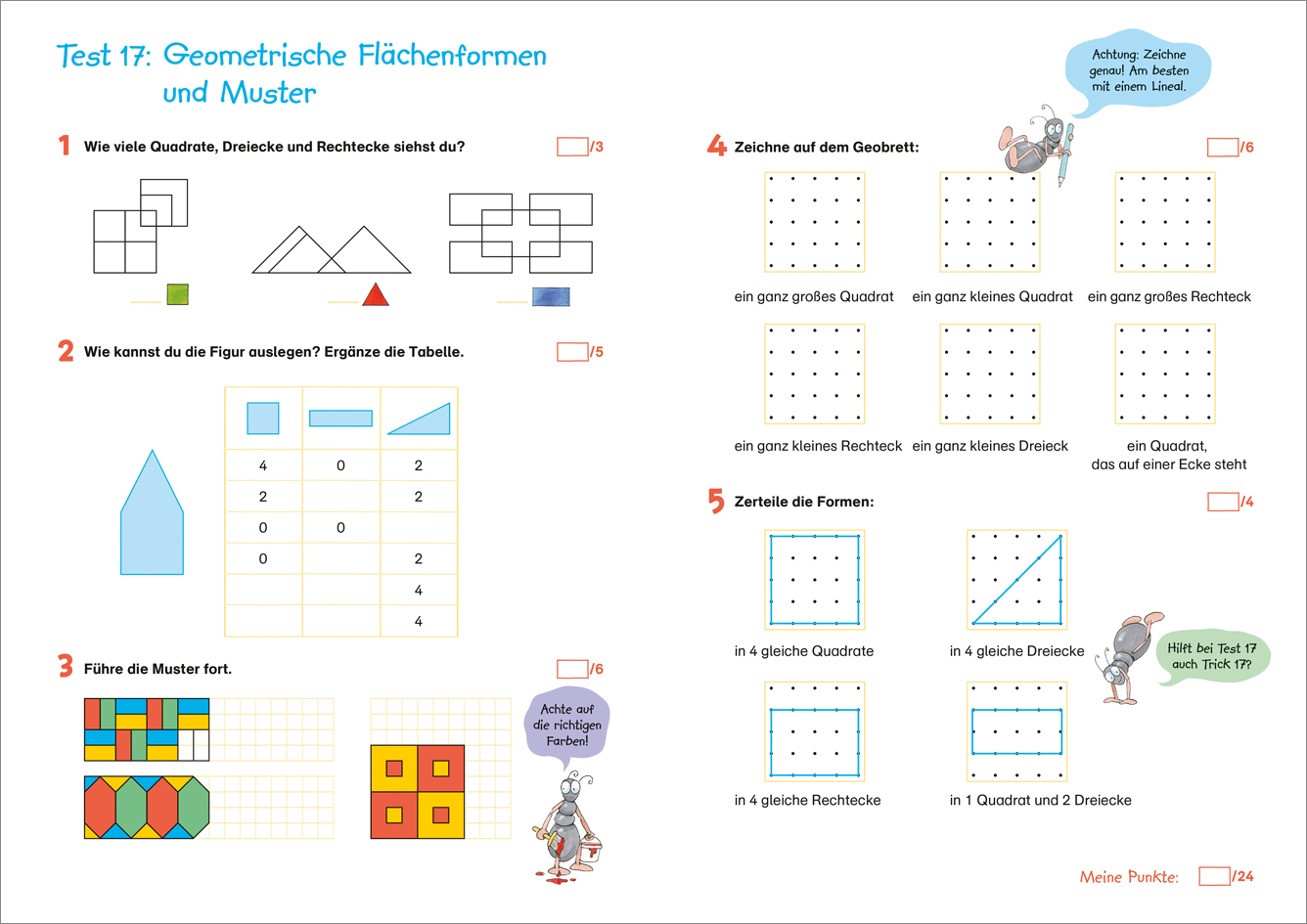 Hier testen die Kinder ihr Wissen im Schulfach Mathe 2. Klasse.Alle relevanten Themen sind als Tests in steigender Schwierigkeitsstufe aufbereitet. Die Tests entsprechen dem Anspruch des Lehrplans und sind im Stil gängiger Klassenarbeit konzipiert. Die Punkte werden mit dem Notenschlüssel verteilt, sodass die eigene Note genau ermittelt werden kann. Die typischen Fit-Ameisencharaktere lockern und muntern zusätzlich mit motivierenden Sprüchen im Heft verteilt auf.