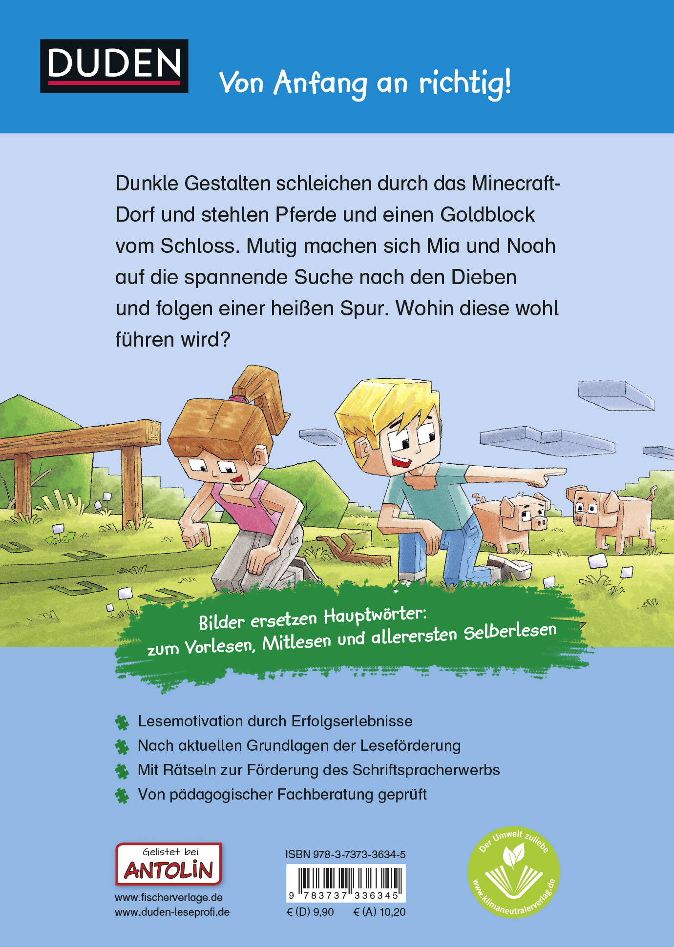 Dunkle Gestalten schleichen durch das Minecraft-Dorf und stehlen die Pferde und einen Goldblock vom Schloss. Mia und Noah schlagen Alarm, doch die Männer aus dem Dorf kommen zu spät. Kurzerhand nehmen die beiden Freunde die Jagd nach den Pferdedieben selbst in die Hand und finden eine heiße Spur. Mutig machen sich die beiden Freunde auf die spannende Suche ... Ob sie es schaffen werden, die Räuber zu finden und zu überlisten?