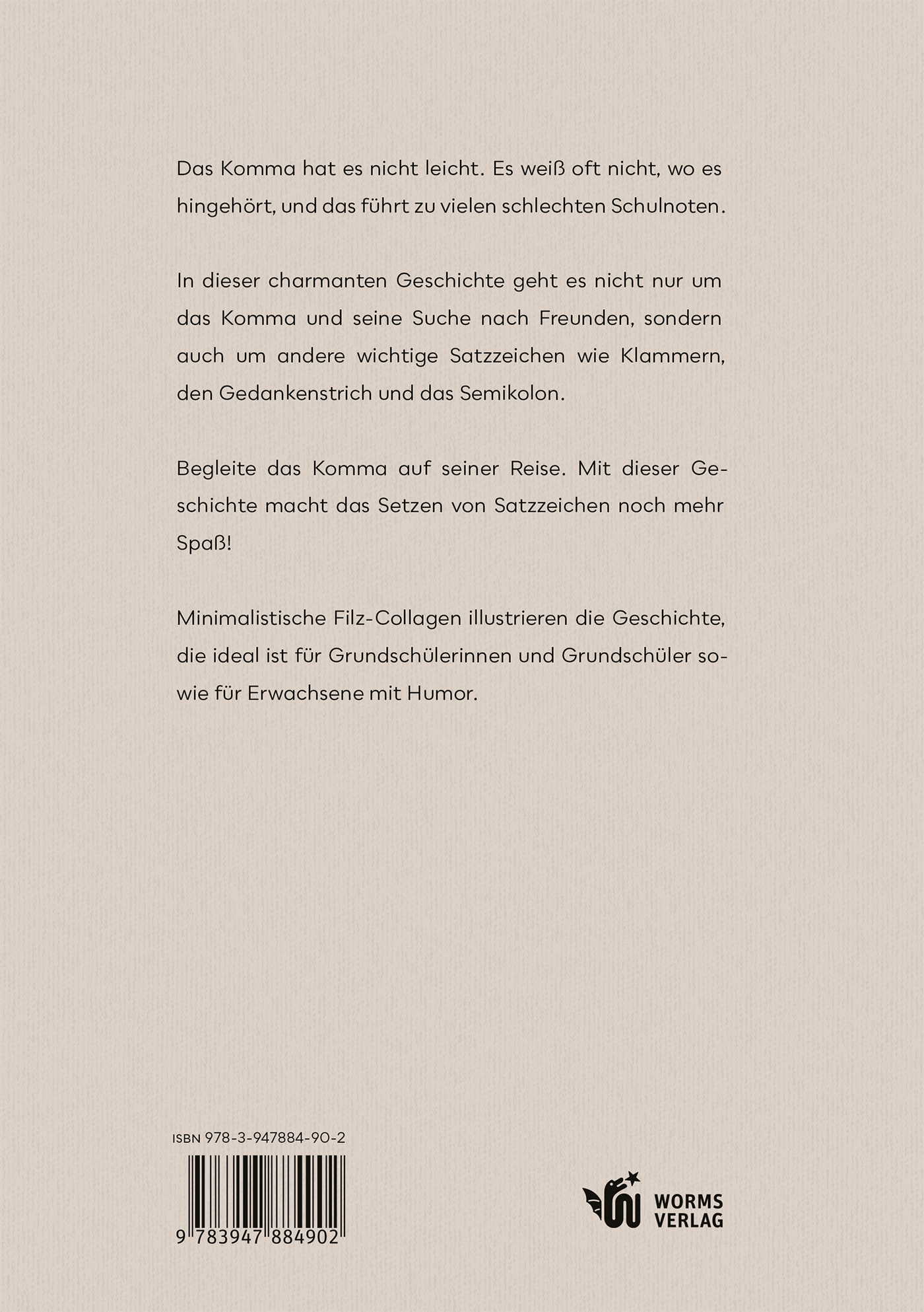 Begleite das Komma auf seiner Reise. Mit dieser Geschichte macht das Setzen von Satzzeichen noch mehr Spaß! Minimalistische Filz-Collagen illustrieren die Geschichte, die ideal ist für Grundschülerinnen und Grundschüler sowie für Erwachsene mit Humor.