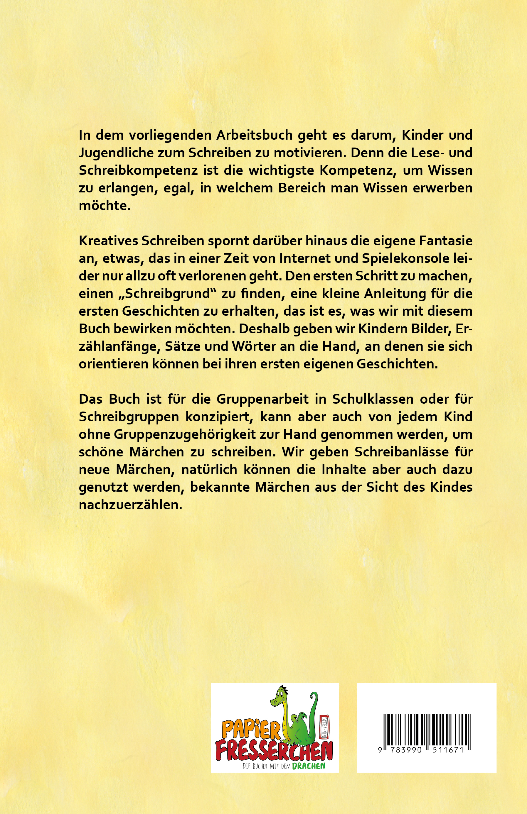 Klappentext:In dem vorliegenden Arbeitsbuch geht es darum, Kinder und Jugendliche zum Schreiben zu motivieren. Denn die Lese- und Schreibkompetenz ist die wichtigste Kompetenz, um Wissen zu erlangen, egal, in welchem Bereich man Wissen erwerben möchte.Kreatives Schreiben spornt darüber hinaus die eigene Fantasie an, etwas, das in einer Zeit von Internet und Spielekonsole leider nur allzu oft verlorenen geht. Den ersten Schritt zu machen, einen "Schreibgrund" zu finden, eine kleine Anleitung für die ersten Geschichten zu erhalten, das ist es, was wir mit diesem Buch bewirken möchten. Deshalb geben wir Kindern Bilder, Erzählanfänge, Sätze und Wörter an die Hand, an denen sie sich orientieren können bei ihren ersten eigenen Geschichten.Das Buch ist für die Gruppenarbeit in Schulklassen oder für Schreibgruppen konzipiert, kann aber auch von jedem Kind ohne Gruppenzugehörigkeit zur Hand genommen werden, um schöne Märchen zu schreiben. Wir geben Schreibanlässe für neue Märchen, natürlich können die Inhalte aber auch dazu genutzt werden, bekannte Märchen aus der Sicht des Kindes nachzuerzählen.