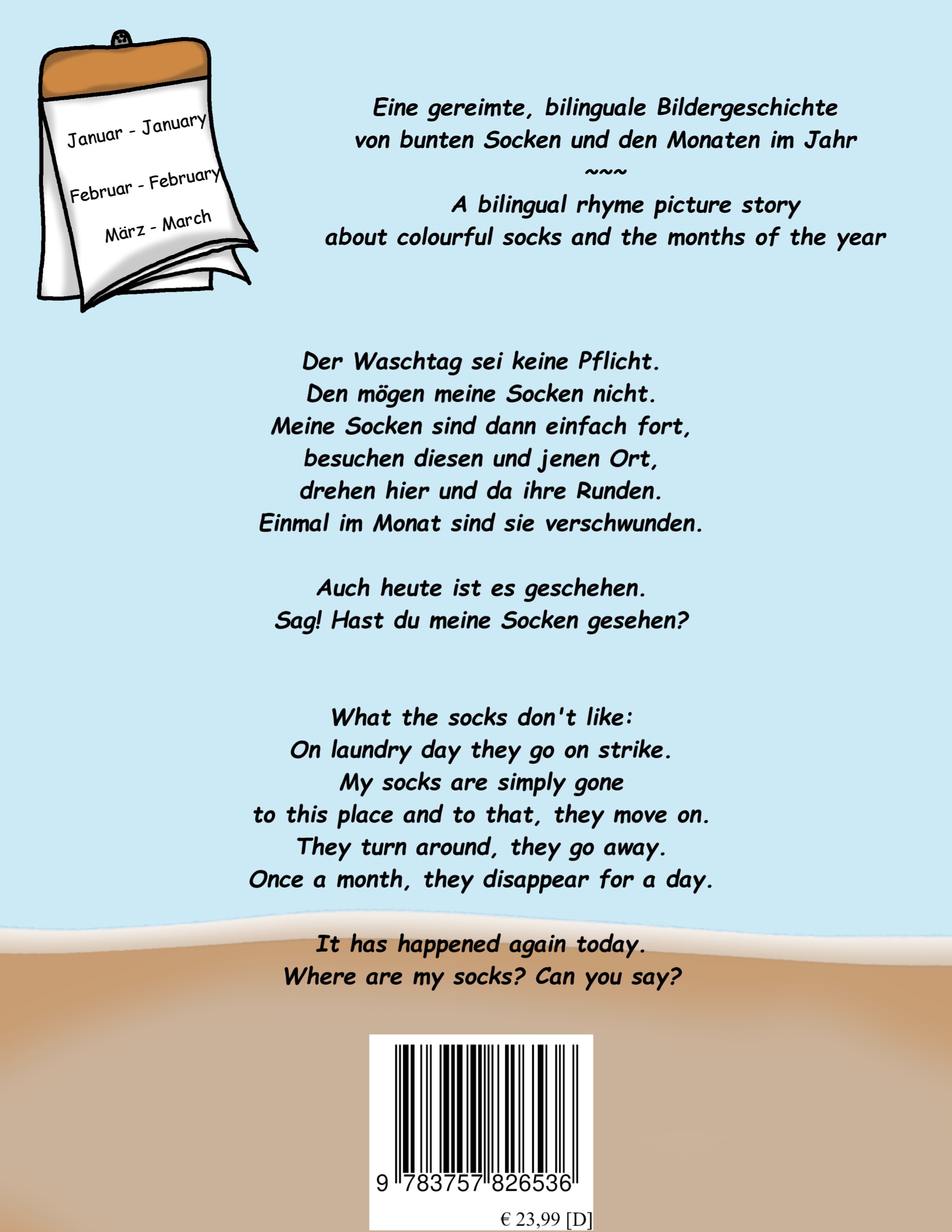 Der Waschtag sei keine Pflicht. Den mögen meine Socken nicht. Meine Socken sind dann einfach fort, besuchen diesen und jenen Ort, drehen hier und da ihre Runden. Einmal im Monat sind sie verschwunden.Eine gereimte, bilinguale Bildergeschichte von bunten Socken und den Monaten im Jahr.Dieses Buch mit seinem Wimmelbild-Charakter führt dich auf der Suche nach den verschwundenen Socken durch die Ereignisse des Jahres und lässt dich zweisprachig zählen.Der Reim der Geschichte verleitet bereits jüngere Zuhörer zum Nachsprechen sowohl der deutschen als auch der englischen Sätze. Die jeweiligen Ausmalseiten fördern u.a. die Feinmotorik.Und eines ist klar: Gewaschen sind sie alle am Ende vom Jahr. Oder etwa nicht?