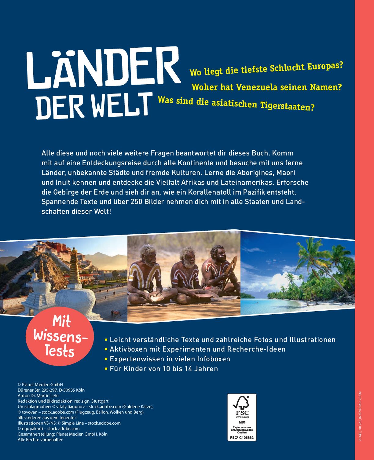 Alle diese und noch viele weitere Fragen beantwortet dir dieses Buch. Komm mit auf eine Entdeckungsreise durch alle Kontinente und besuche mit uns ferne Länder, unbekannte Städte und fremde Kulturen. Lerne die Aborigines, Maori und Inuit kennen und entdecke die Vielfalt Afrikas und Lateinamerikas. Erforsche die Gebirge der Erde und sieh dir an, wie ein Korallenatoll im Pazifik entsteht. Spannende Texte und über 250 Bilder nehmen dich mit in alle Staaten und Landschaften dieser Welt!