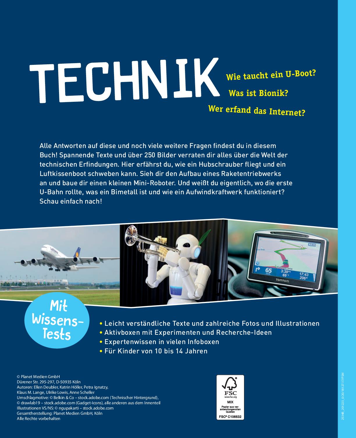 Alle Antworten auf diese und noch viele weitere Fragen findest du in diesem Buch! Spannende Texte und über 250 Bilder verraten dir alles über die Welt der technischen Erfindungen. Hier erfährst du, wie ein Hubschrauber fliegt und ein Luftkissenboot schweben kann. Sieh dir den Aufbau eines Raketentriebwerks an und baue dir einen kleinen Mini-Roboter. Und weißt du eigentlich, wo die erste U-Bahn rollte, was ein Bimetall ist und wie ein Aufwindkraftwerk funktioniert?