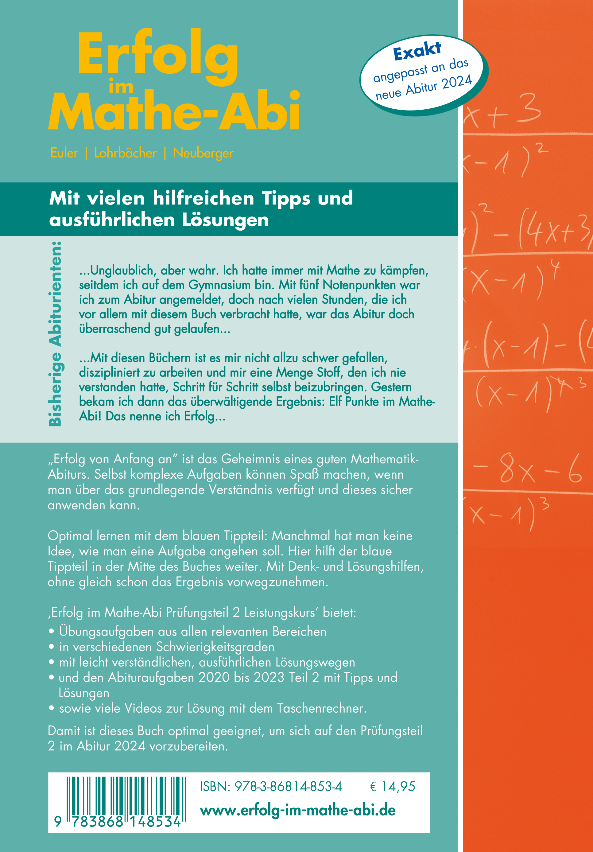 Erfolgreiche Vorbereitung auf das Abitur 2024 Maßgeschneidert für das hessische Mathematik-Abitur 2024, enthält dieses Übungsbuch Aufgaben, die in Umfang und Anspruch dem Prüfungsteil 2 der schriftlichen Abiturprüfung im Leistungskurs mit dem wissenschaftlichen Taschenrechner entsprechen. Dieses Übungsbuch baut ideal auf "Erfolg im Mathe-Abi Hessen Leistungskurs Prüfungsteil 1: Hilfsmittelfreier Teil" auf und bietet zusammen mit den Lernkarten eine vollständige Vorbereitung auf die Abiturprüfung im Leistungskurs.Optimal lernen mit dem blauen Tippteil: Manchmal hat man keine Idee, wie man eine Aufgabe angehen soll. Hier hilft der blaue Tippteil in der Mitte des Buches weiter. Mit Denk- und Lösungshilfen, ohne gleich schon das Ergebnis vorwegzunehmen.Konzipiert zur Vorbereitung auf das Mathe-Abitur - im Unterricht des letzten Schuljahres vor dem Abitur oder als ideale Ergänzung.'Erfolg im Mathe-Abi' Hessen Prüfungsteil 2: Wissenschaftlicher Taschenrechner Leistungskurs bietet:- Übungsaufgaben aus allen relevanten Bereichen- mit leicht verständlichen, ausführlichen Lösungswegen- und die Abituraufgaben 2020 bis 2023 Teil 2- jeweils mit Tipps und Lösungen- sowie viele Videos zur Lösung mit dem Taschenrechner.Damit ist dieses Buch optimal geeignet, um sich auf Leistungskursniveau auf den Prüfungsteil 2 im Abitur 2024 vorzubereiten.