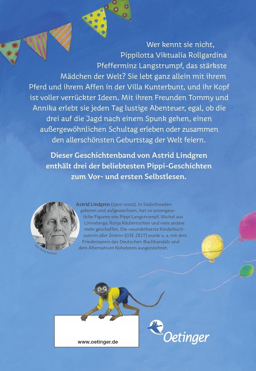 - Extra dick: Der Sammelband enthält die Geschichten "Pippi findet einen Spunk", "Pippi geht in die Schule" und "Pippi feiert Geburtstag".