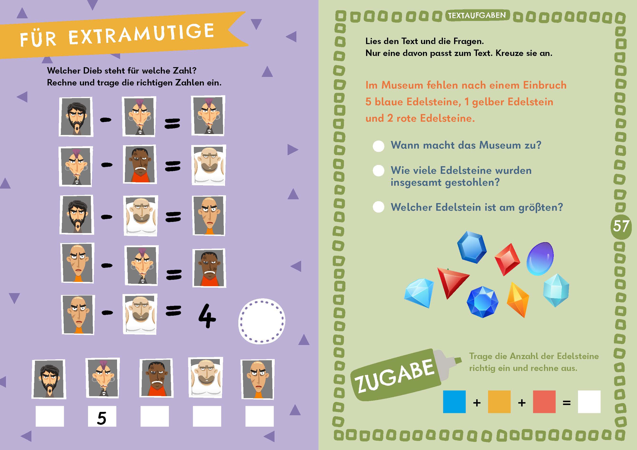 Spielerisches Rechnen und Zahlenknobeleien machen gleich noch mehr Spaß, wenn clevere Detektivinnen und schnüffelnde Spürnasen dabei auftauchen. Ein bisschen Mut gehört auch dazu, denn Kinder knacken in diesem Rätselbuch geheimnisvolle Zahlencodes, schlängeln sich durchs Zahlenlabyrinth oder rechnen aus, wie viel Gold der Bankräuber erbeutet hat. Von den Zahlen über das Erfassen von Mengen bis hin zu Plus- und Minusaufgaben im Zahlenraum bis 20 - Kinder werden hier Schritt für Schritt zum Rechenprofi. Und wenn es ein wenig kniffliger sein darf, bieten Zugaben und Sonderseiten für Extramutige einen zusätzlichen Lernanreiz.