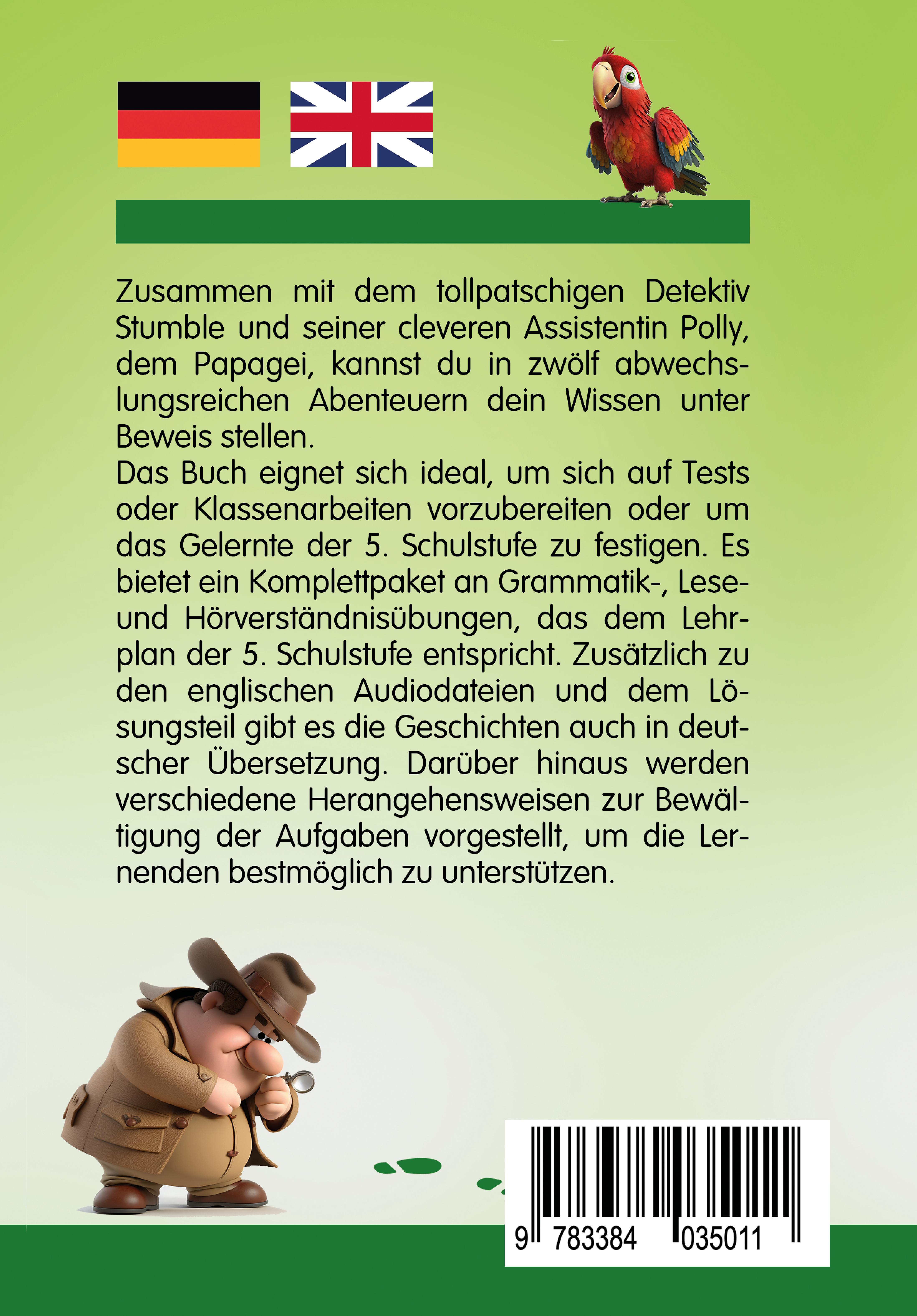 Suchst du nach einer unterhaltsamen und effektiven Methode, um Englisch zu lernen? Dann ist dieses Buch genau das Richtige für dich!Zusammen mit dem tollpatschigen Detektiv Stumble und seiner cleveren Assistentin Polly kannst du in 12 spannenden Abenteuern dein Können unter Beweis stellen und die beiden bei ihren Ermittlungen unterstützen.Das Buch wurde von Lehrern entwickelt und entspricht dem Lehrplan der 5. Schulstufe.Jede der Geschichten beinhaltet einen anderen Grammatik Schwerpunkt und hilft dir dabei dich ideal auf Tests und Klassenarbeiten vorzubereiten.Was dich erwartet:- Die Audiodateien werden dir helfen, die richtige Aussprache zu lernen und dein Hörverständnis zu verbessern.- Mit den Grammatikübungen lernst du, den Satzbau sowie einfache Zeitformen zu verstehen und diese richtig anzuwenden.- Neue Vokabeln werden dir helfen, deinen Wortschatz zu erweitern. Nach jeder Geschichte findest du passende Übungen, bei denen du die neuen Wörter gleich anwenden kannst.- Mit den Verständnisfragen kannst du überprüfen, ob du den Inhalt der Geschichten auch wirklich begriffen hast.- Mit der Übersetzung kannst du nochmal jedes Detail der Geschichte nachlesen.- Um dich optimal zu unterstützen, werden zudem differenzierte Herangehensweisen zur Lösung der Aufgaben erläutert.Deine Eltern und Lehrer werden stolz auf dich und deinen Fortschritt sein!Ich wünsche dir viel Spaß und Erfolg beim Lernen,Prof. Dominik Hoffmann
