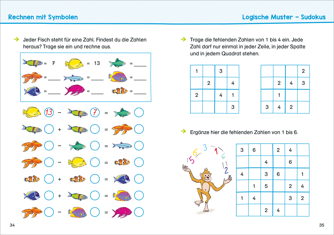 Mit ersten Textaufgaben und spielerisch gestalteten Knobelaufgaben trainieren die Kinder logisches Denken, erfassen mathematische Zusammenhänge und üben das Rechnen bis 20 – all das, was sie für das Fach Mathematik brauchen. Sie gehen als Zahlendetektive auf Spurensuche, Knobeln mit Geld und Zeit, navigieren sich durch ein Spukschloss, lösen Sudokus und Logicals. Der clevere Knobelspaß ist an den Lehrplänen für Mathematik orientiert. So macht das Üben richtig Spaß – und geht beim Rätseln und Knobeln ganz nebenbei!