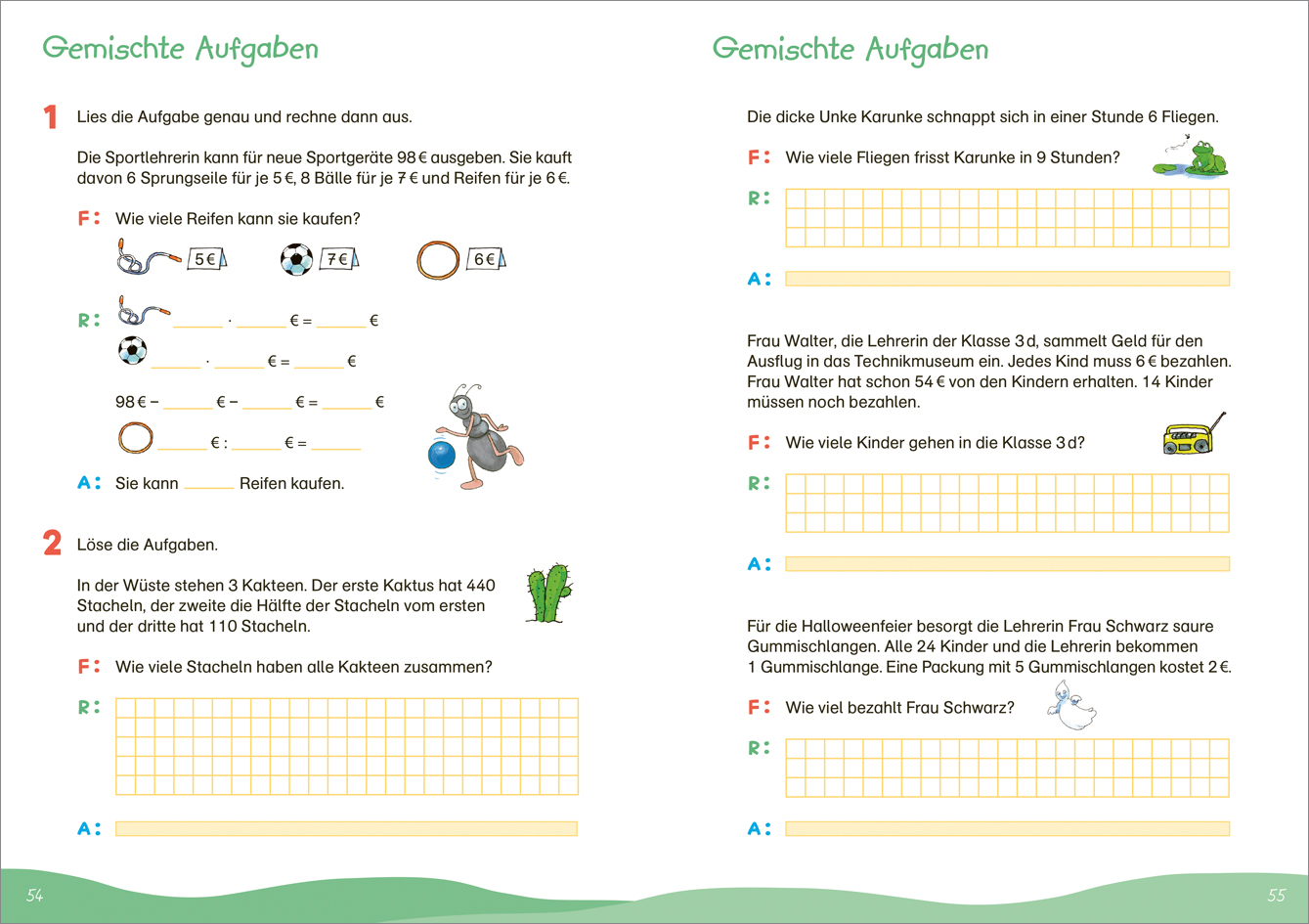 Mit Fit für Textaufgaben 3. Klasse. Mein Übungsheft erarbeiten Kinder das Lösen von Textaufgaben von Grund auf. Welche Informationen sind wichtig? Wie komme ich vom Text zur Rechnung? Anhand einer großen Vielfalt von Textaufgaben lernen sie, Lösungsstrategien routiniert anzuwenden. Die Übungen umfassen unter anderem das Rechnen bis 1.000, schriftliche Addition und Subtraktion sowie das Rechnen mit verschiedenen Größen wie Zeit, Geld, Längen und Gewichten. Zur einfachen Kontrolle der Ergebnisse gibt es ein herausnehmbares Lösungsheft. Als zusätzliche Motivation bekommen die Kinder witzige Ameisensticker, die auf einen ausmalbaren Stickerbogen aufgeklebt werden können. Ist der Bogen voll und alle Aufgaben gelöst, sind die Kinder fit für Textaufgaben in der 3. Klasse.