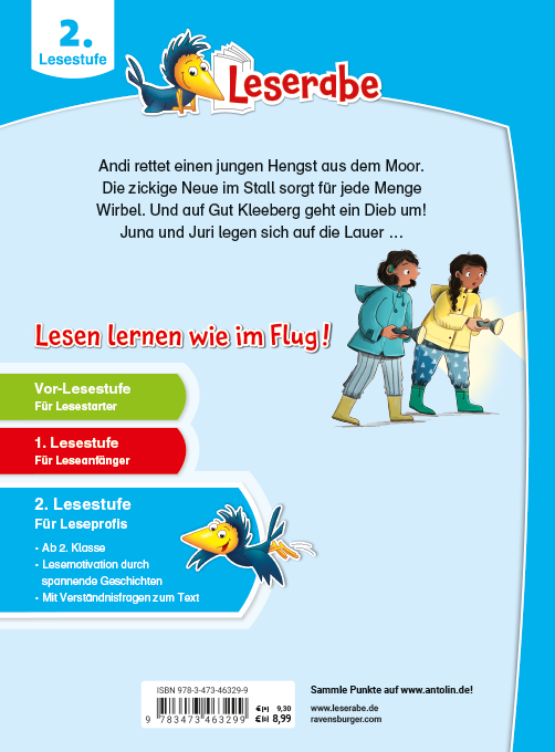 Lesen lernen wie im Flug! Drei spannende Geschichten vom Reiterhof: Mia und Andi retten einen jungen Hengst aus dem Moor. Die zickige Neue im Stall will über alle Pferde und Reiterinnen bestimmen und sorgt auf dem Turnier für jede Menge Wirbel. Und auf dem Ponyhof Gut Kleeberg gibt es viel Ablenkung vom Reiten, denn es geht ein Dieb um! Juri und Juna legen sich am Abend auf die Lauer ...