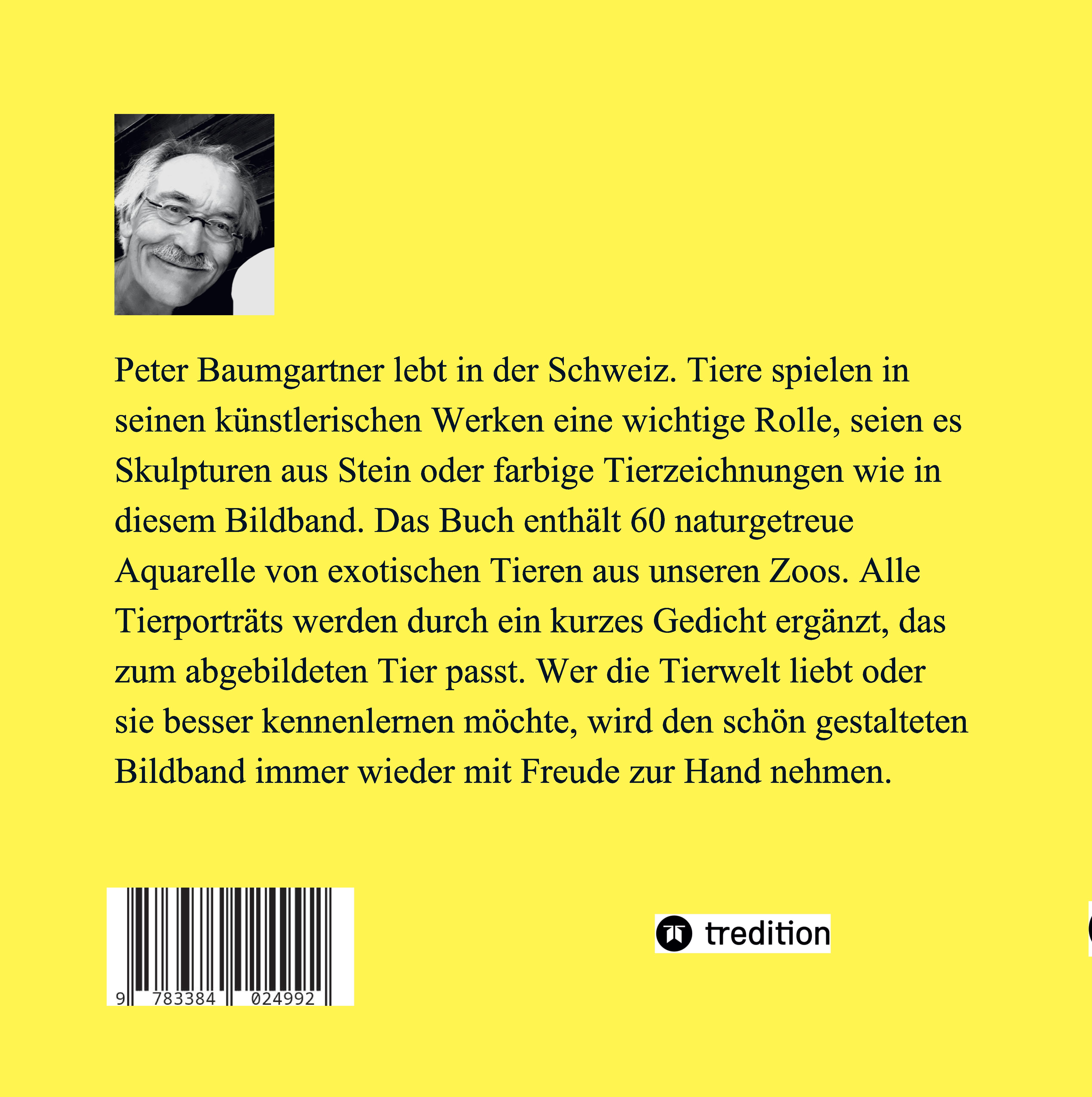 Naturgetreue Aquarelle von exotischen Tieren aus unseren Zoos. Jedes Tierporträt wird durch ein kurzes Gedicht ergänzt, das zum abgebildeten Tier passt und uns etwas über sein Leben, seine Umwelt oder seinen Charakter erzählt.
