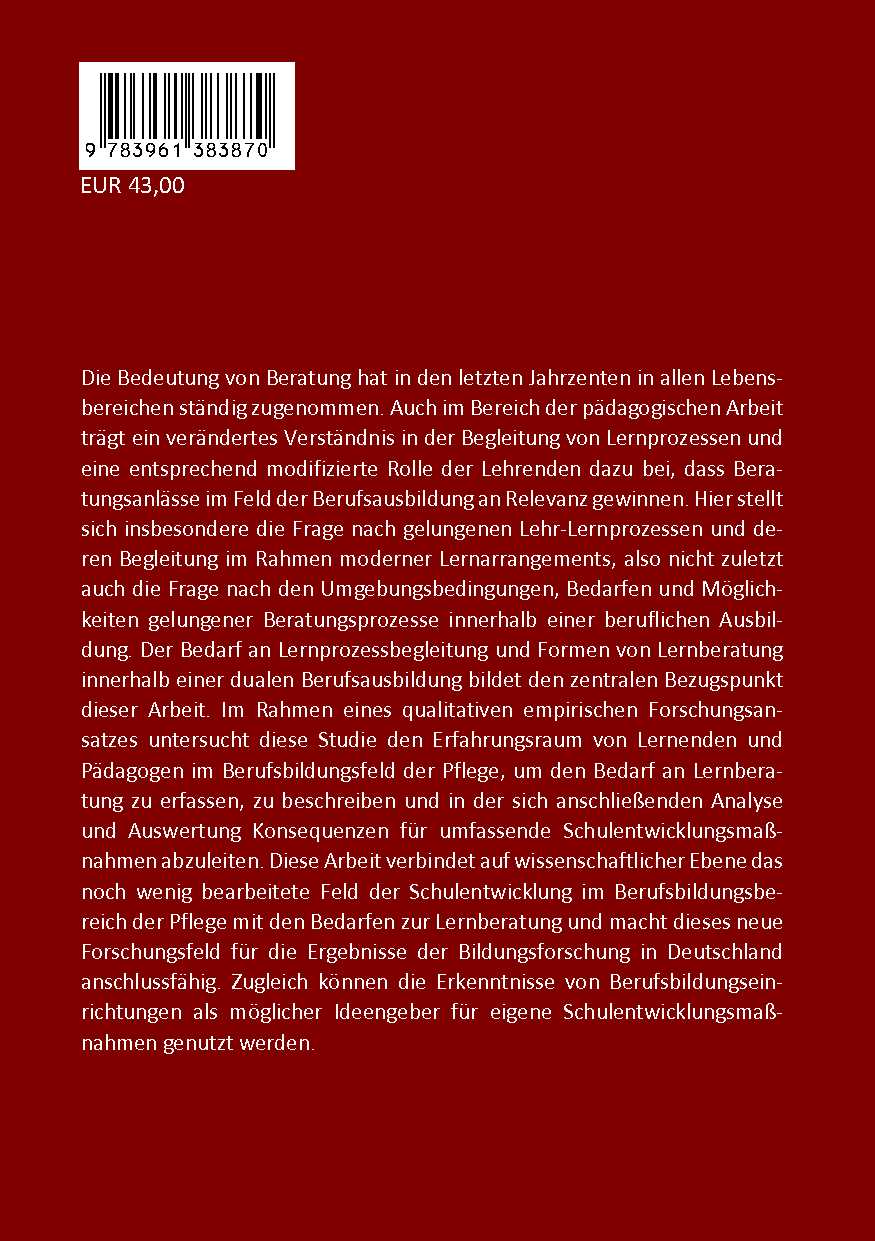 Die Bedeutung von Beratung hat in den letzten Jahrzenten in allen Lebensbereichen ständig zugenommen. Auch im Bereich der pädagogischen Arbeit trägt ein verändertes Verständnis in der Begleitung von Lernprozessen und eine entsprechend modifizierte Rolle der Lehrenden dazu bei, dass Beratungsanlässe im Feld der Berufsausbildung an Relevanz gewinnen. Hier stellt sich insbesondere die Frage nach gelungenen Lehr-Lernprozessen und deren Begleitung im Rahmen moderner Lernarrangements, also nicht zuletzt auch die Frage nach den Umgebungsbedingungen, Bedarfen und Möglichkeiten gelungener Beratungsprozesse innerhalb einer beruflichen Ausbildung. Der Bedarf an Lernprozessbegleitung und Formen von Lernberatung innerhalb einer dualen Berufsausbildung bildet den zentralen Bezugspunkt dieser Arbeit. Im Rahmen eines qualitativen empirischen Forschungsansatzes untersucht diese Studie den Erfahrungsraum von Lernenden und Pädagogen im Berufsbildungsfeld der Pflege, um den Bedarf an Lernberatung zu erfassen, zu beschreiben und in der sich anschließenden Analyse und Auswertung Konsequenzen für umfassende Schulentwicklungsmaßnahmen abzuleiten. Diese Arbeit verbindet auf wissenschaftlicher Ebene das noch wenig bearbeitete Feld der Schulentwicklung im Berufsbildungsbereich der Pflege mit den Bedarfen zur Lernberatung und macht dieses neue Forschungsfeld für die Ergebnisse der Bildungsforschung in Deutschland anschlussfähig. Zugleich können die Erkenntnisse von Berufsbildungseinrichtungen als möglicher Ideengeber für eigene Schulentwicklungsmaßnahmen genutzt werden.