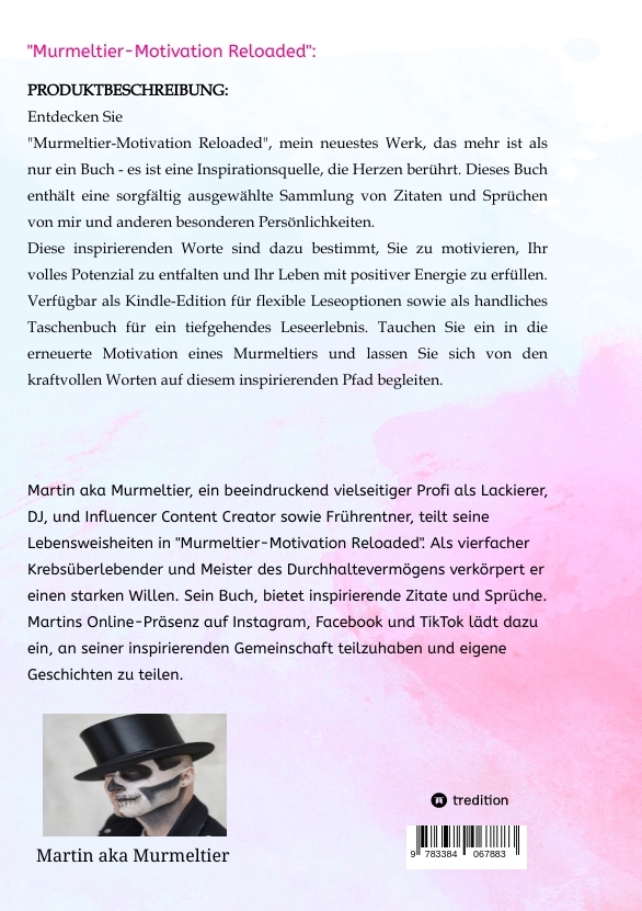 Ich bin Martin, auch bekannt als Martin aka Murmeltier. In meiner Autobiografie "Überlebenskampf: Eine Reise durch das Leben mit Handicap & 4x Krebs" erzähle ich meine inspirierende Lebensgeschichte, geprägt von unglaublichem Überlebenswillen und Mut. Diese bewegende Geschichte ist in verschiedenen Formaten erhältlich, darunter gebundene Ausgabe, Taschenbuch und Kindle auf Amazon und auf Tredition als Taschenbuch. Sie sind unter den folgenden ISBNs verfügbar: "Überlebenskampf: Eine Reise durch das Leben mit Handicap & 4x Krebs": 📖 Taschenbuch-Ausgabe: ISBN-13: 979-8862643800 Preis: 6,00€ - Amazon 📖 Gebundene Ausgabe: ISBN-13: 979-8862970586 Preis: 17,00€ - Amazon 📖 Kindle Ausgabe für nur 1,07€ 📖 Kindle Unlimited Version im Amazon Abonnement: 0,00€ - Amazon 📖 Des Weiteren, Taschenbuch-Ausgabe: ISBN-13: 978-3-384-06748-7 Preis: 10,00€ (anderes Design) - Tretidion weitere Händler folgen! Ich habe meine Erfahrung geteilt, um die Stärke des menschlichen Geistes zu zeigen, und lade Sie ein, mein Buch zu lesen und sich von meiner außergewöhnlichen Reise inspirieren zu lassen. Des Weiteren freue ich mich, Ihnen mein neues Buch "Murmeltier-Motivation Reloaded" vorzustellen. Dieses Buch ist in den Formaten Kindle und Taschenbuch auf Amazon erhältlich, sowie auf Tredition als Taschenbuch und enthält eine Sammlung von Zitaten & Sprüchen, sowohl von mir als auch von anderen besonderen Persönlichkeiten, zur Inspiration und Motivation. Die ISBN für "Murmeltier-Motivation Reloaded" lautet: 📖 Taschenbuch-Ausgabe: ISBN-13: 979-8867685553 Preis: 6,00€ - Amazon 📖 Kindle Ausgabe für nur 0,89€ 📖 Kindle Unlimited Version im Amazon Abonnement: 0,00€ - Amazon 📖 Des Weiteren, Taschenbuch-Ausgabe: ISBN-13: 978-3-384-06788-3 Preis: 10,00€ (anderes Design) - Tretidion weitere Händler folgen! Ich möchte gerne mit Ihnen teilen, warum ich KI (ChatGPT) in meinem kreativen Schreibprozess nutze. KI hat sich für mich als unverzichtbare Unterstützung erwiesen, da ich persönliche Herausforderungen, darunter eine Wortfindungsstörung und Taubheitsgefühle in den Händen, bewältigen muss. Mehr darüber finden Sie auf meiner Webseite. Ich danke Ihnen für Ihr Interesse und Verständnis, während ich diese spannende Reise fortsetze. Meine Webpräsenz:https://www.martinakamurmelltier-survival.de