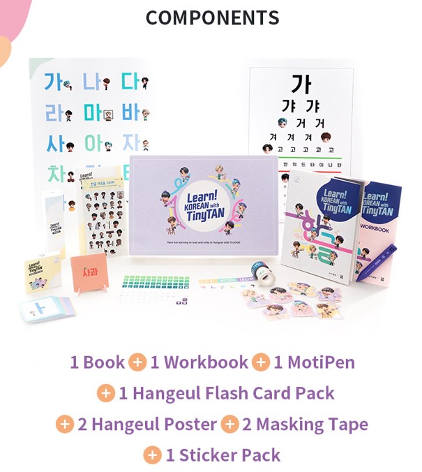 Koreanisch lernen für Anfänger - mit Sprachstift und den Stimmen von BTSThe package is designed for beginners and focuses on the Korean alphabet. Comprised of a textbook, a workbook, a poster of the Korean alphabet, vocabulary cards, masking tapes and stickers, the kit also comes with the MotiPen - a pen that reads out the pronunciation of each word in Korean, English, Japanese and Spanish when placed on text. You'll have each BTS member help you through the language-learning journey with words of encouragement hidden inside the books. Using a QR code, fans can also have the full setup in the voice of their favorite member. You can head to the official website to get your hands on the language-learning package.This book is based on the story of Bora, an avid BTS fan. She explores Hangeul and learns how to read, write and fluently pronounce Korean words in the book.This book set contains: * Book and Workbook * Purple Motipen (upgradeable for "Talk with BTS") * USB cable * 2 Hangeul posters * Hangeul Flash Cards * Masking Tape * Keyboard stickers