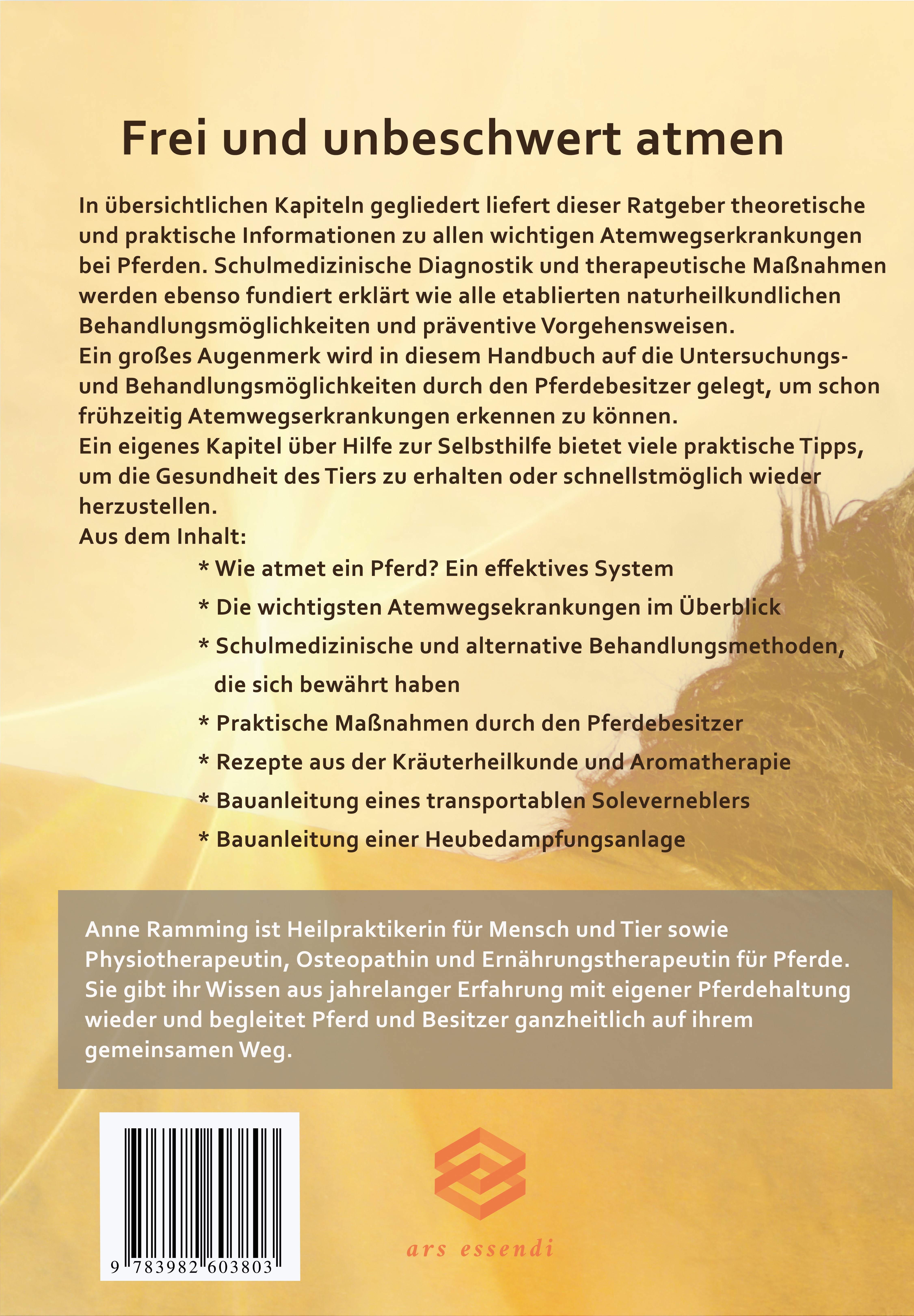 * Bauanleitung einer Heubedampfungsanlage Anne Ramming ist Heilpraktikerin für Mensch und Tier sowie Physiotherapeutin, Osteopathin und Ernährungstherapeutin für Pferde. Sie gibt ihr Wissen aus jahrelanger Erfahrung mit eigener Pferdehaltung wieder und begleitet Pferd und Besitzer ganzheitlich auf ihrem gemeinsamen Weg.
