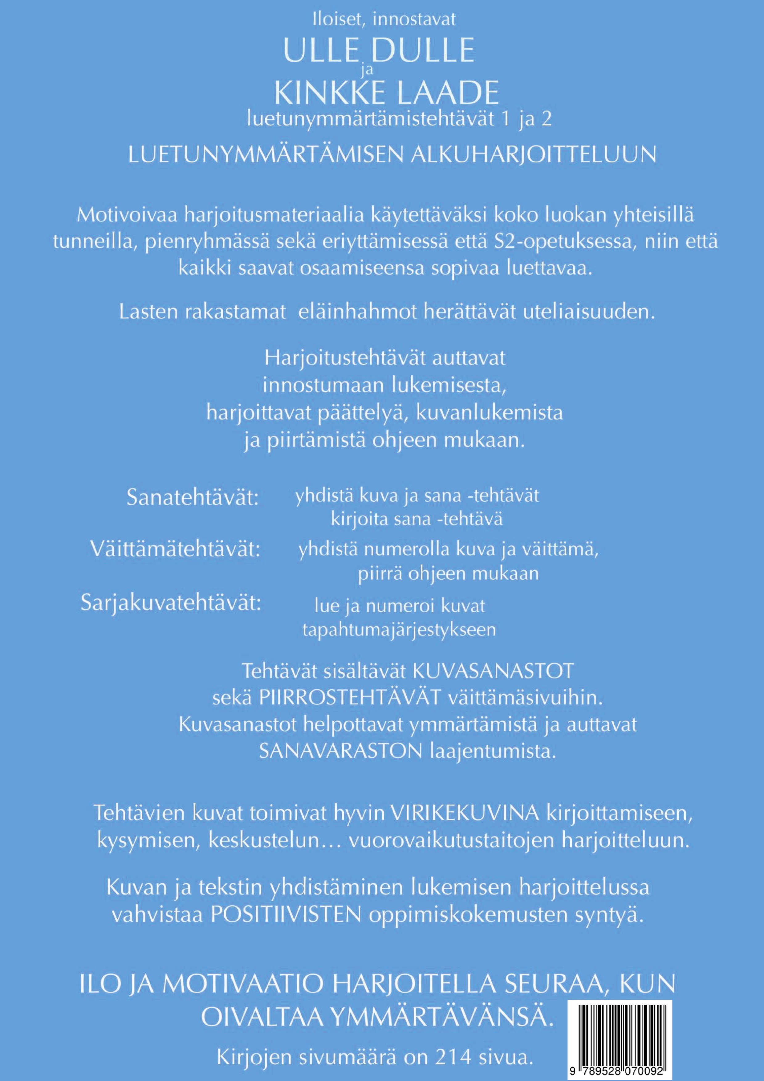 Ulle Dulle ja Kinkke Laade luetunymmärtämistehtäväkirjat 1 ja 2 sisältävät motivoivaa harjoitusmateriaalia käytettäväksi koko luokan yhteisillä tunneilla, pienryhmässä sekä eriyttämisessä että S2-opetuksessa, niin että kaikki saavat osaamiseensa sopivaa luettavaa.