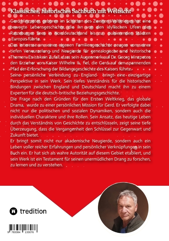 Klappentext : Gerd Hinzpeter, geboren im Schatten des Zweiten Weltkrieges hat eine bewegte Lebensgeschichte, die ihn von den idyllischen Ufern des Ratzeburger Sees in Norddeutschland bis zu pulsierenden Städten Europas führte. Als Hamburger Schifffahrtskaufmann legte er den Grundstein für sein weitreichendes Verständnis geopolitischer Zusammenhänge. Seine Interaktion mit verschiedenen Kulturen ließen in ihm das Interesse für historische Verknüpfungen und ihre Auswirkungen auf die Gegenwart wachsen. Das Interesse an seiner eigenen Familiengeschichte zeugen von seiner tiefen Verwurzelung und Neugierde für genealogische und historische Themen. Es ist kein Zufall, dass sein Augenmerk auf Dr. Georg Hinzpeter, den Erzieher von Kaiser Wilhelm II., fiel, die Gerd auf den spannenden Pfad der Erforschung der Bildungsgeschichte des Kaisers führte, denn....unserer Kaiser war ja 50% Engländer ! Seine eigene persönliche Verbindung zu England bringt eine einzigartige Perspektive in sein Werk. Sein tiefes Verständnis für die historischen Bindungen zwischen England und Deutschland macht ihn zu einem Experten für die deutsch-britische Beziehungsgeschichte. Die Frage nach den Gründen für den Ersten Weltkrieg, das globale Drama, wurde zu einer persönlichen Mission für Gerd. Er verfolgte dabei nicht nur die politischen und sozialen Dynamiken, sondern auch die individuellen Charaktere und ihre Rollen. Sein Ansatz, das heutige Leben durch das Verständnis von Geschichte zu entschlüsseln, zeigt seine tiefe Überzeugung, dass die Vergangenheit den Schlüssel zur Gegenwart und Zukunft bietet. Er bringt somit nicht nur akademische Neugierde, sondern auch ein Leben voller reicher Erfahrungen und persönlicher Verknüpfungen in sein Buch ein. Er hat sich als wahre Autorität auf diesem Gebiet etabliert, und sein Werk ist ein Testament für seinen unermüdlichen Drang zu forschen, zu lernen und zu verstehen. Freundschaft zwischen England und Deutschland: Ich heiratete meine englische Frau, Bonnie. - Schon der deutsche Prinz Albert von Sachsen-Coburg und Gotha heiratete 1840 die Queen Victoria von Groβbritannien. Das 1. Kind war Victoria. Sie heiratete ebenfalls einen deutschen Prinzen, wie ihre Mutter, Friedrich III. – Das erste Kind war unser späterer Kaiser Wilhelm II.. Damit war er nicht nur der Enkel von Queen Victoria sondern auch eben halber Engländer. Er wurde der mächtigste Mann in der Welt, hatte keine Schuldgefühle, flüchtete nach Holland und starb nicht mal als ein Held.