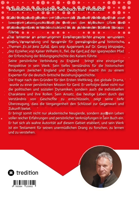 Klappentext : Gerd Hinzpeter, geboren im Schatten des Zweiten Weltkrieges hat eine bewegte Lebensgeschichte, die ihn von den idyllischen Ufern des Ratzeburger Sees in Norddeutschland bis zu pulsierenden Städten Europas führte. Als Hamburger Schifffahrtskaufmann legte er den Grundstein für sein weitreichendes Verständnis geopolitischer Zusammenhänge. Seine Interaktion mit verschiedenen Kulturen ließen in ihm das Interesse für historische Verknüpfungen und ihre Auswirkungen auf die Gegenwart wachsen. Das Interesse an seiner eigenen Familiengeschichte zeugen von seiner tiefen Verwurzelung und Neugierde für genealogische und historische Themen. Es ist kein Zufall, dass sein Augenmerk auf Dr. Georg Hinzpeter, den Erzieher von Kaiser Wilhelm II., fiel, die Gerd auf den spannenden Pfad der Erforschung der Bildungsgeschichte des Kaisers führte, denn....unserer Kaiser war ja 50% Engländer ! Seine eigene persönliche Verbindung zu England bringt eine einzigartige Perspektive in sein Werk. Sein tiefes Verständnis für die historischen Bindungen zwischen England und Deutschland macht ihn zu einem Experten für die deutsch-britische Beziehungsgeschichte. Die Frage nach den Gründen für den Ersten Weltkrieg, das globale Drama, wurde zu einer persönlichen Mission für Gerd. Er verfolgte dabei nicht nur die politischen und sozialen Dynamiken, sondern auch die individuellen Charaktere und ihre Rollen. Sein Ansatz, das heutige Leben durch das Verständnis von Geschichte zu entschlüsseln, zeigt seine tiefe Überzeugung, dass die Vergangenheit den Schlüssel zur Gegenwart und Zukunft bietet. Er bringt somit nicht nur akademische Neugierde, sondern auch ein Leben voller reicher Erfahrungen und persönlicher Verknüpfungen in sein Buch ein. Er hat sich als wahre Autorität auf diesem Gebiet etabliert, und sein Werk ist ein Testament für seinen unermüdlichen Drang zu forschen, zu lernen und zu verstehen. Freundschaft zwischen England und Deutschland: Ich heiratete meine englische Frau, Bonnie. - Schon der deutsche Prinz Albert von Sachsen-Coburg und Gotha heiratete 1840 die Queen Victoria von Groβbritannien. Das 1. Kind war Victoria. Sie heiratete ebenfalls einen deutschen Prinzen, wie ihre Mutter, Friedrich III. – Das erste Kind war unser späterer Kaiser Wilhelm II.. Damit war er nicht nur der Enkel von Queen Victoria sondern auch eben halber Engländer. Er wurde der mächtigste Mann in der Welt, hatte keine Schuldgefühle, flüchtete nach Holland und starb nicht mal als ein Held.