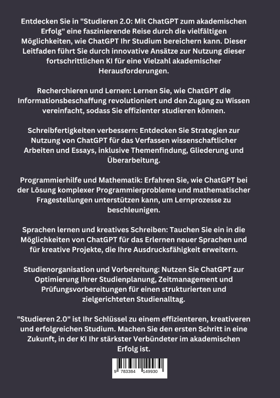 Entdecken Sie in "Studieren 2.0: Mit ChatGPT zum akademischen Erfolg" eine faszinierende Reise durch die vielfältigen Möglichkeiten, wie ChatGPT Ihr Studium bereichern kann. Dieser Leitfaden führt Sie durch innovative Ansätze zur Nutzung dieser fortschrittlichen KI für eine Vielzahl akademischer Herausforderungen.Recherchieren und Lernen: Lernen Sie, wie ChatGPT die Informationsbeschaffung revolutioniert und den Zugang zu Wissen vereinfacht, sodass Sie effizienter studieren können.Schreibfertigkeiten verbessern: Entdecken Sie Strategien zur Nutzung von ChatGPT für das Verfassen wissenschaftlicher Arbeiten und Essays, inklusive Themenfindung, Gliederung und Überarbeitung.Programmierhilfe und Mathematik: Erfahren Sie, wie ChatGPT bei der Lösung komplexer Programmierprobleme und mathematischer Fragestellungen unterstützen kann, um Lernprozesse zu beschleunigen.Sprachen lernen und kreatives Schreiben: Tauchen Sie ein in die Möglichkeiten von ChatGPT für das Erlernen neuer Sprachen und für kreative Projekte, die Ihre Ausdrucksfähigkeit erweitern.Studienorganisation und Vorbereitung: Nutzen Sie ChatGPT zur Optimierung Ihrer Studienplanung, Zeitmanagement und Prüfungsvorbereitungen für einen strukturierten und zielgerichteten Studienalltag."Studieren 2.0" ist Ihr Schlüssel zu einem effizienteren, kreativeren und erfolgreichen Studium. Machen Sie den ersten Schritt in eine Zukunft, in der KI Ihr stärkster Verbündeter im akademischen Erfolg ist.
