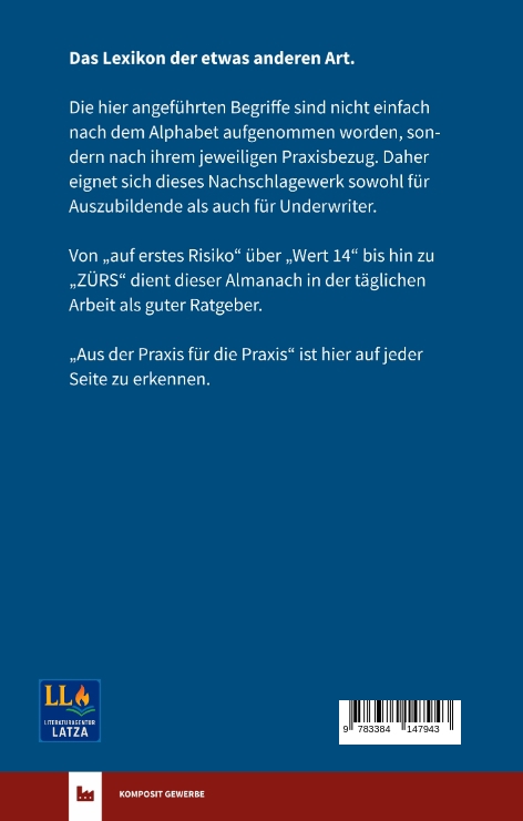 Die hier angeführten Begriffe sind nicht einfach nach dem Alphabet aufgenommen worden, sondern nach ihrem jeweiligen Praxisbezug. Daher eignet sich dieses Nachschlagewerk sowohl für Auszubildende als auch für Underwriter. Von "auf erstes Risiko" über "Wert 14" bis hin zu "ZÜRS" dient dieser Almanach in der täglichen Arbeit als guter Ratgeber. "Aus der Praxis für die Praxis" ist hier auf jeder zu erkennen.