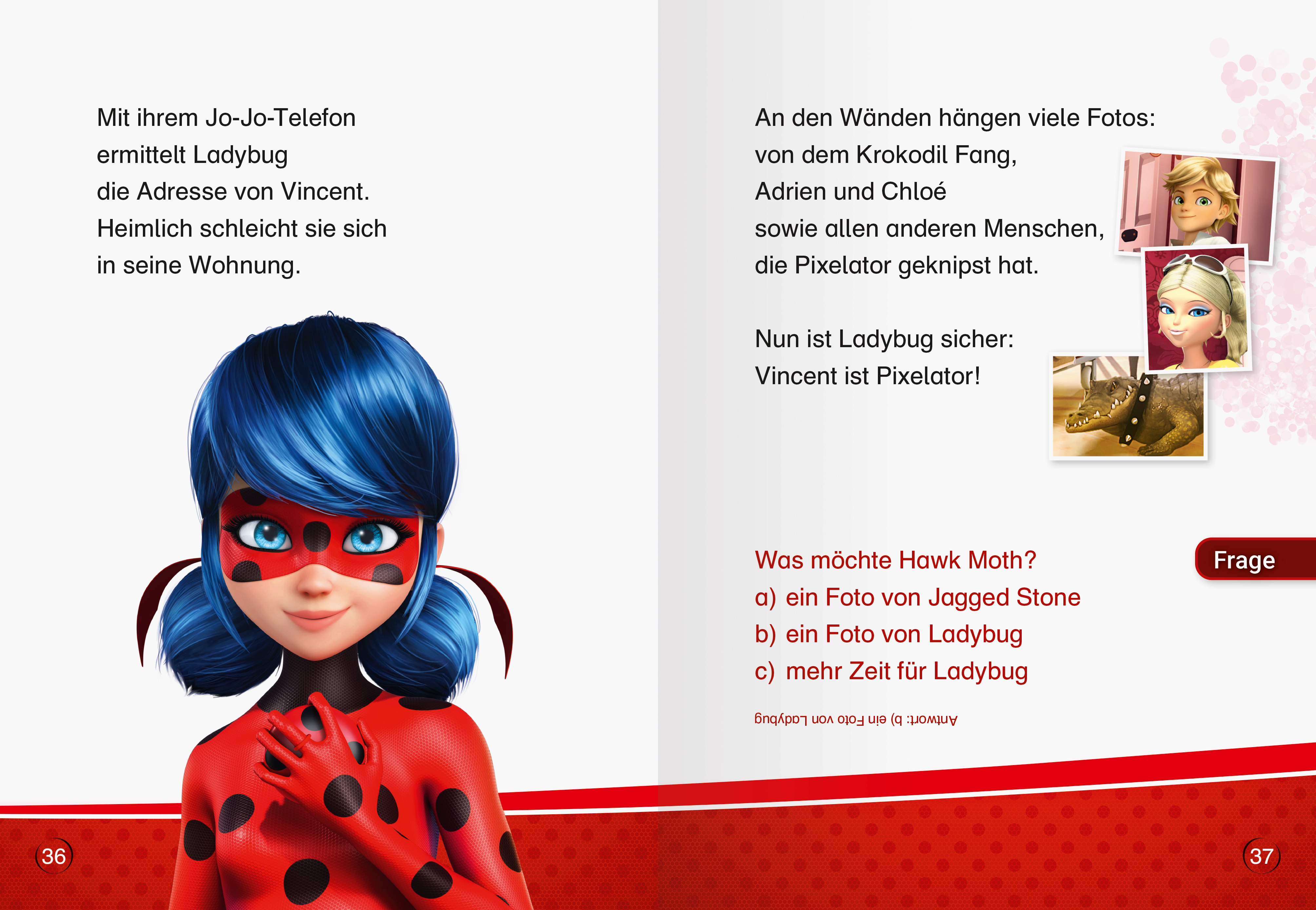 Lesenlernen mit den Lieblingshelden Ladybug und Cat Noir: Mit Miraculous macht lesen Spaß! Vincent ist großer Fan des Rockstars Jagged Stone und will unbedingt ein Foto mit ihm. Doch Vincent wird abgewiesen. Hawk Moth nutzt die negativen Emotionen und verwandelt Vincent in einen Superschurken: Pixelator. Mit seiner Kamera fängt Pixelator unschuldige Menschen ein und hält sie auf seiner Speicherkarte gefangen. Ladybug und Cat Noir müssen ihn stoppen! Dieses Erstlesebuch zu einer der derzeit beliebtesten Serien im TV und Streaming bringt die Spannung und Abenteuer von Miraculous auch abseits des Bildschirms ins eigene Zuhause. In einfachen Sätzen und kurzen Kapiteln mit vielen Bildern wird eine ganze Folge der Serie für Kinder ab 7 Jahren nacherzählt. Seite für Seite lesen sie die Geschichte selbst und werden Wort für Wort zum Leseprofi. Die Quizfragen am Ende jedes Kapitels machen Spaß und prüfen ganz nebenbei das Textverständnis. Mit Ladybug und Cat Noir die Welt retten und nebenbei lesen üben. So cool können Bücher sein!