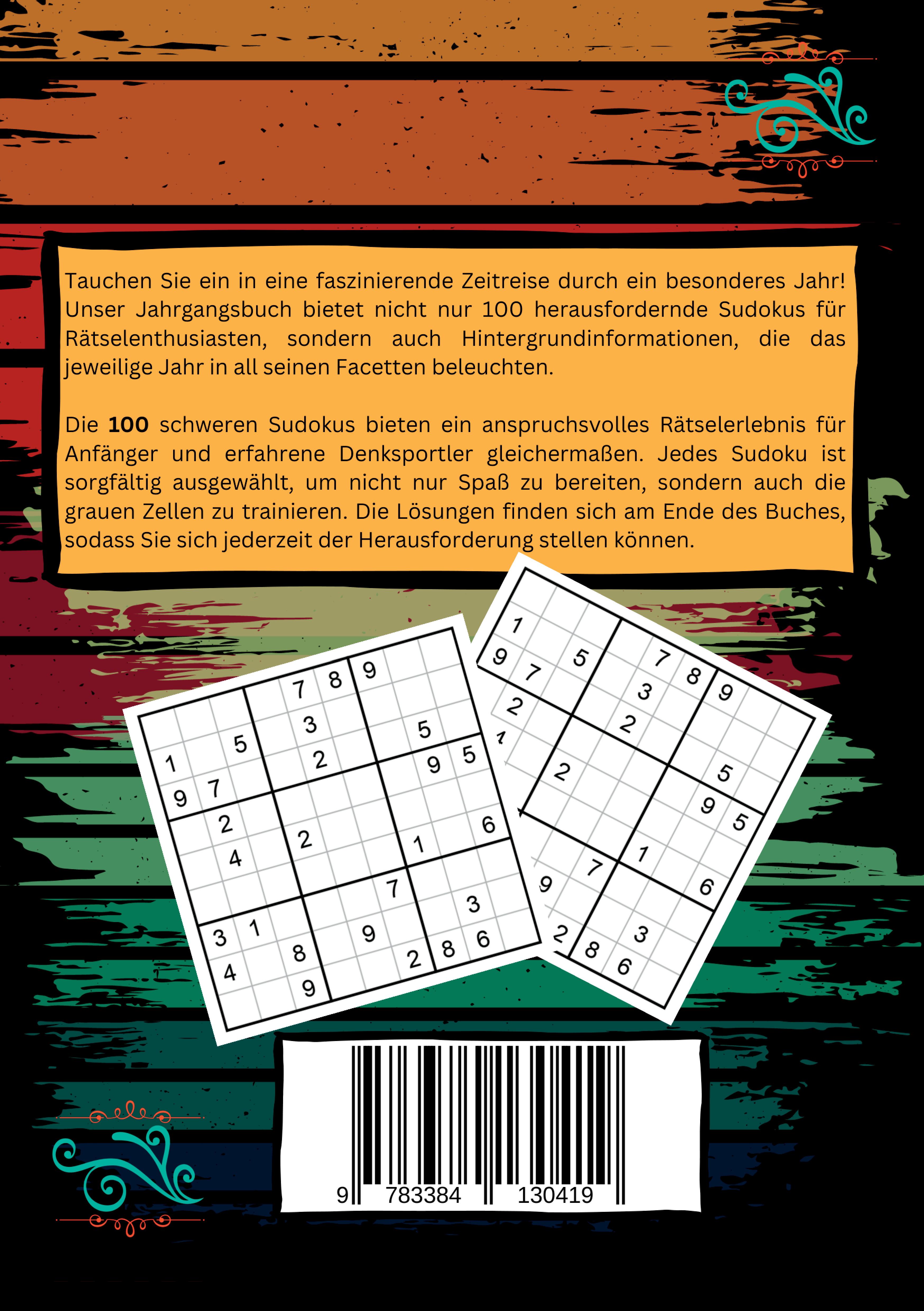 Tauchen Sie ein in eine faszinierende Zeitreise durch ein besonderes Jahr! Unser Jahrgangsbuch bietet nicht nur 100 herausfordernde Sudokus für Rätselenthusiasten, sondern auch Hintergrundinformationen, die das jeweilige Jahr in all seinen Facetten beleuchten. 100 schwere Sudokus bieten ein anspruchsvolles Rätselerlebnis für Anfänger und erfahrene Denksportler gleichermaßen. Jedes Sudoku ist sorgfältig ausgewählt, um nicht nur Spaß zu bereiten, sondern auch die grauen Zellen zu trainieren. Die Lösungen finden sich am Ende des Buches, sodass Sie sich jederzeit der Herausforderung stellen können.Doch dieses Buch ist mehr als nur ein Rätselspaß - es ist eine Zeitkapsel für Ihr gewähltes Jahr. Tauchen Sie ein in die historischen Ereignisse und kulturellen Meilensteine, die das Jahr geprägt haben. Von bedeutenden politischen Ereignissen über kulturelle Trends bis hin zu bewegenden sportlichen Geschichten - all diese Aspekte sind in unserem Jahrgangsbuch vereint."Das Jahrgangsbuch: Rätselspaß und Zeitreise" ist nicht nur eine Herausforderung für den Geist, sondern auch eine einzigartige Reise durch die Geschichte. Gönnen Sie sich selbst oder einem besonderen Menschen dieses einzigartige Geschenk, das Unterhaltung, Wissen und nostalgische Momente vereint.