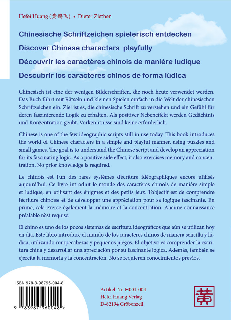 Chinesisch ist eine der wenigen Bilderschriften, die noch heute verwendet werden. Das Buch führt mit Rätseln und kleinen Spielen einfach in die Welt der chinesischen Schriftzeichen ein. Ziel ist es, die chinesische Schrift zu verstehen und ein Gefühl für deren faszinierende Logik zu erhalten. Als positiver Nebeneffekt werden Gedächtnis und Konzentration geübt. Vorkenntnisse sind keine erforderlich. Chinese is one of the few ideographic scripts still in use today. This book introduces the world of Chinese characters in a simple and playful manner, using puzzles and small games. The goal is to understand the Chinese script and develop an appreciation for its fascinating logic. As a positive side effect, it also exercises memory and concentration. No prior knowledge is required. Le chinois est l’un des rares systèmes d’écriture idéographiques encore utilisés