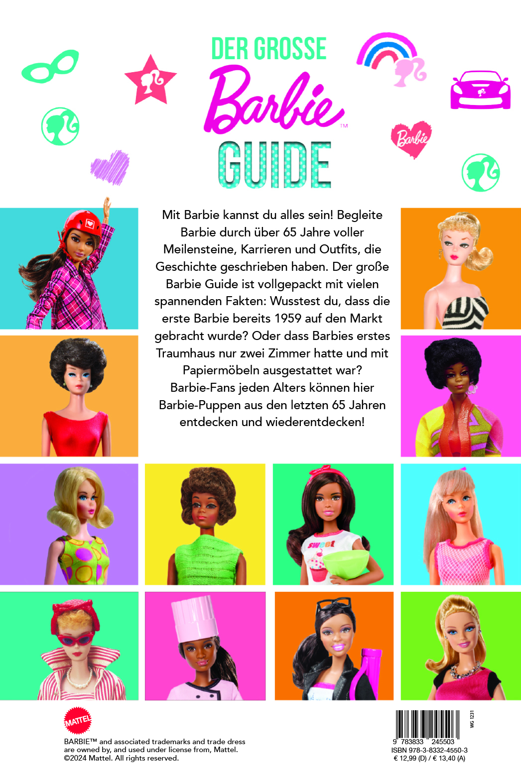 Mit Barbie kannst du alles sein! Begleite Barbie durch über 65 Jahre an Meilensteinen, Karrieren und Outfits, die Geschichte geschrieben haben. Der große Barbie Guide ist vollgepackt mit vielen spannenden Fakten: Wusstest du, dass die erste Barbie bereits 1959 auf den Markt gebracht wurde? Oder dass Barbies erstes Traumhaus nur zwei Zimmer hatte und mit Papiermöbeln ausgestattet war? Barbie-Fans jeden Alters können hier Barbie-Puppen aus den letzten 65 Jahren entdecken und wiederentdecken!