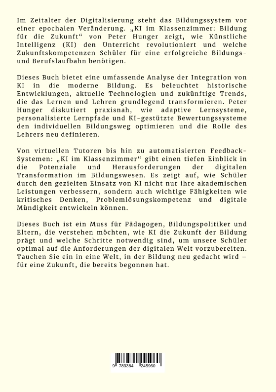 Im Zeitalter der Digitalisierung steht das Bildungssystem vor einer epochalen Veränderung. "KI im Klassenzimmer: Bildung für die Zukunft" von Peter Hunger zeigt, wie Künstliche Intelligenz (KI) den Unterricht revolutioniert und welche Zukunftskompetenzen Schüler für eine erfolgreiche Bildungs- und Berufslaufbahn benötigen.Dieses Buch bietet eine umfassende Analyse der Integration von KI in die moderne Bildung. Es beleuchtet historische Entwicklungen, aktuelle Technologien und zukünftige Trends, die das Lernen und Lehren grundlegend transformieren. Peter Hunger diskutiert praxisnah, wie adaptive Lernsysteme, personalisierte Lernpfade und KI-gestützte Bewertungssysteme den individuellen Bildungsweg optimieren und die Rolle des Lehrers neu definieren.Von virtuellen Tutoren bis hin zu automatisierten Feedback-Systemen: "KI im Klassenzimmer" gibt einen tiefen Einblick in die Potenziale und Herausforderungen der digitalen Transformation im Bildungswesen. Es zeigt auf, wie Schüler durch den gezielten Einsatz von KI nicht nur ihre akademischen Leistungen verbessern, sondern auch wichtige Fähigkeiten wie kritisches Denken, Problemlösungskompetenz und digitale Mündigkeit entwickeln können.Dieses Buch ist ein Muss für Pädagogen, Bildungspolitiker und Eltern, die verstehen möchten, wie KI die Zukunft der Bildung prägt und welche Schritte notwendig sind, um unsere Schüler optimal auf die Anforderungen der digitalen Welt vorzubereiten. Tauchen Sie ein in eine Welt, in der Bildung neu gedacht wird - für eine Zukunft, die bereits begonnen hat.
