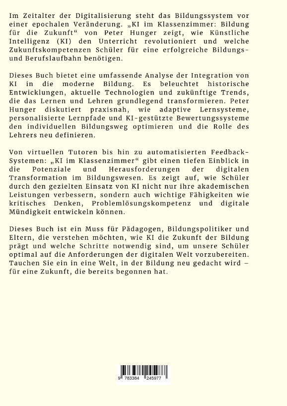 Im Zeitalter der Digitalisierung steht das Bildungssystem vor einer epochalen Veränderung. "KI im Klassenzimmer: Bildung für die Zukunft" von Peter Hunger zeigt, wie Künstliche Intelligenz (KI) den Unterricht revolutioniert und welche Zukunftskompetenzen Schüler für eine erfolgreiche Bildungs- und Berufslaufbahn benötigen.Dieses Buch bietet eine umfassende Analyse der Integration von KI in die moderne Bildung. Es beleuchtet historische Entwicklungen, aktuelle Technologien und zukünftige Trends, die das Lernen und Lehren grundlegend transformieren. Peter Hunger diskutiert praxisnah, wie adaptive Lernsysteme, personalisierte Lernpfade und KI-gestützte Bewertungssysteme den individuellen Bildungsweg optimieren und die Rolle des Lehrers neu definieren.Von virtuellen Tutoren bis hin zu automatisierten Feedback-Systemen: "KI im Klassenzimmer" gibt einen tiefen Einblick in die Potenziale und Herausforderungen der digitalen Transformation im Bildungswesen. Es zeigt auf, wie Schüler durch den gezielten Einsatz von KI nicht nur ihre akademischen Leistungen verbessern, sondern auch wichtige Fähigkeiten wie kritisches Denken, Problemlösungskompetenz und digitale Mündigkeit entwickeln können.Dieses Buch ist ein Muss für Pädagogen, Bildungspolitiker und Eltern, die verstehen möchten, wie KI die Zukunft der Bildung prägt und welche Schritte notwendig sind, um unsere Schüler optimal auf die Anforderungen der digitalen Welt vorzubereiten. Tauchen Sie ein in eine Welt, in der Bildung neu gedacht wird - für eine Zukunft, die bereits begonnen hat.